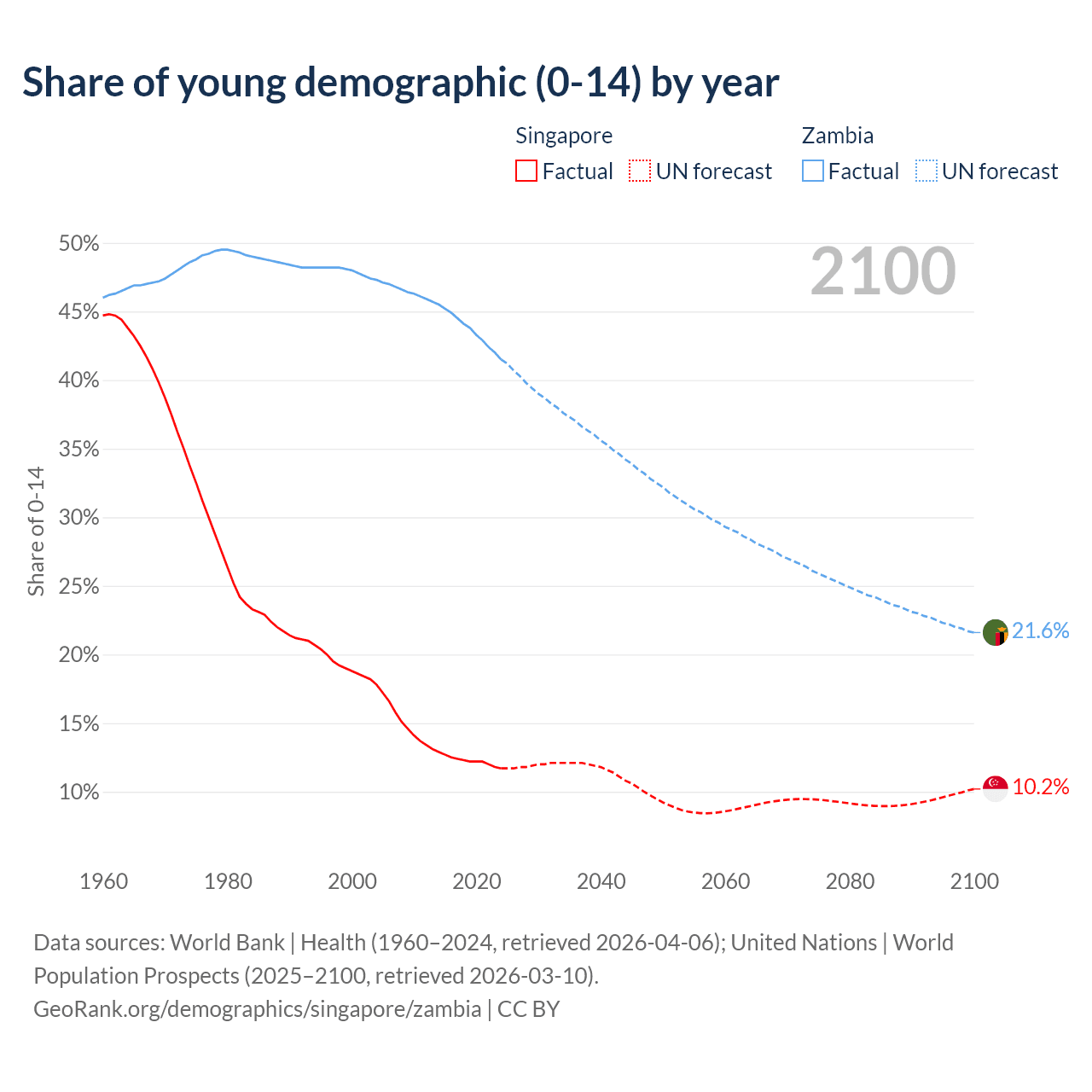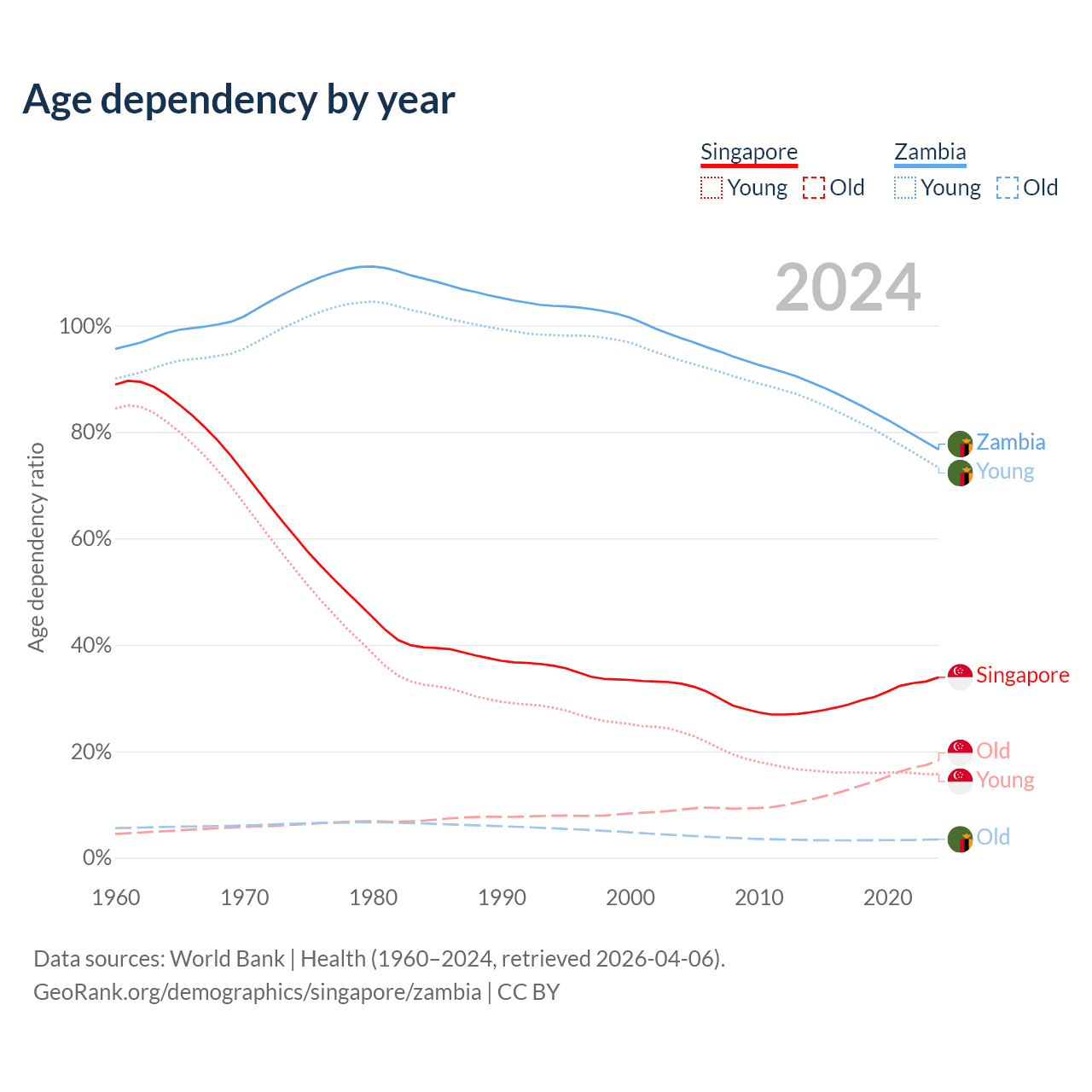 The share of older people aged 65 and over is 13.7% in Singapore and 1.95% in Zambia. Life expectancy in Singapore compared to Zambia .
