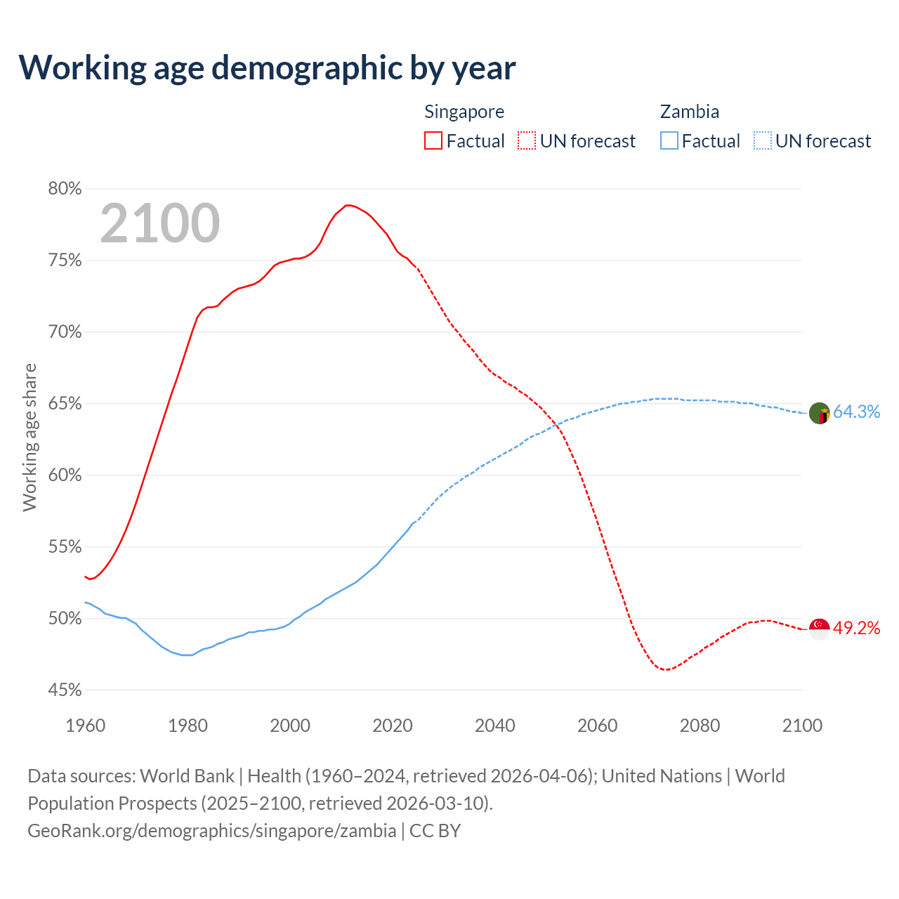 - Singapore has 4.57M working age adults (aged 15-64) vs 12.8M in Zambia.
