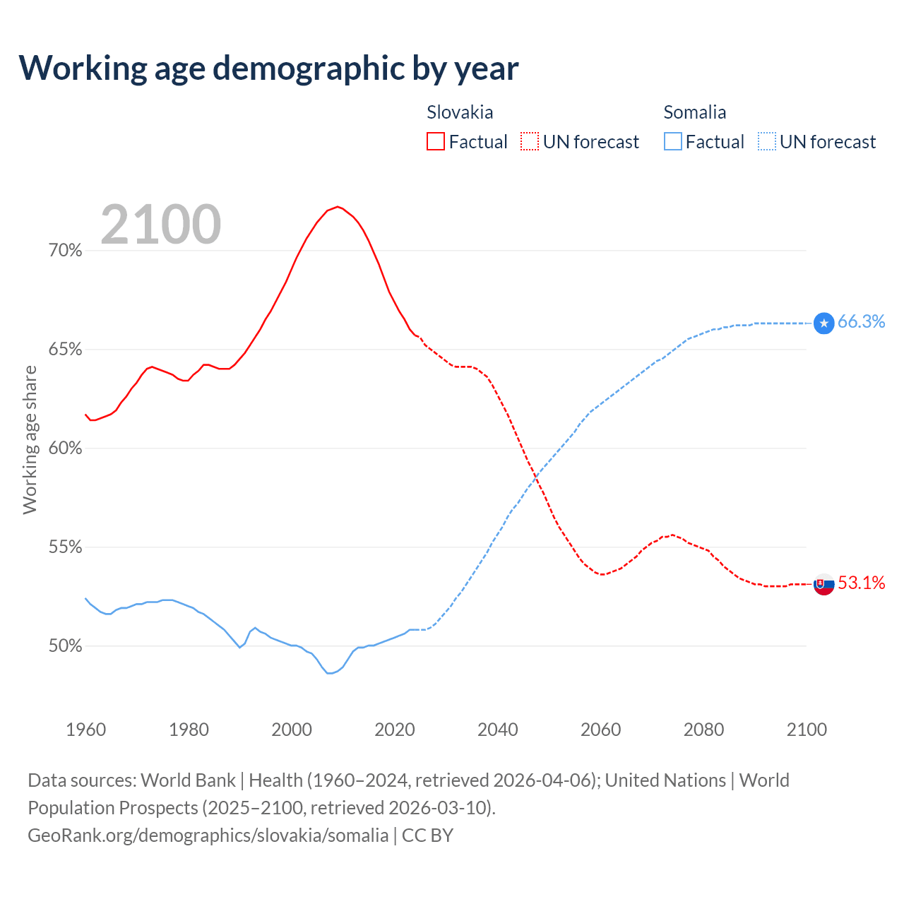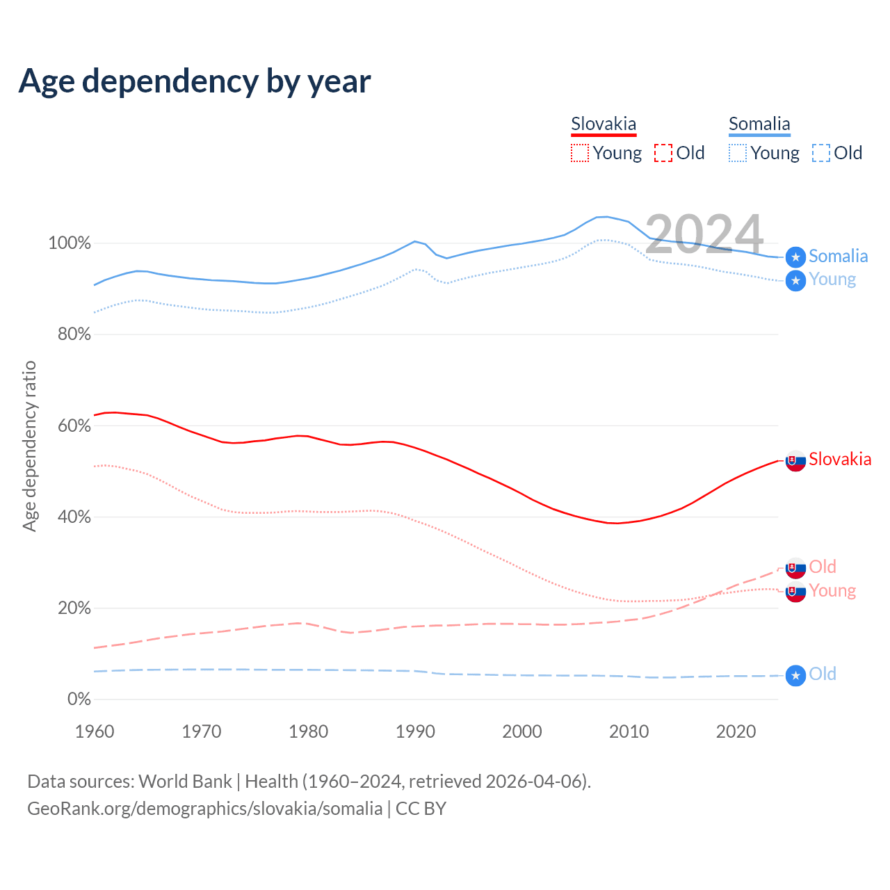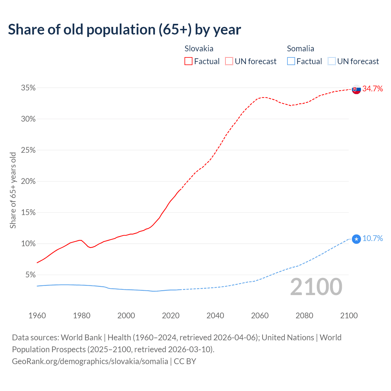 - The share of old-age demographic (65+) in Slovakia is 18.5% vs 2.59% in Somalia.
