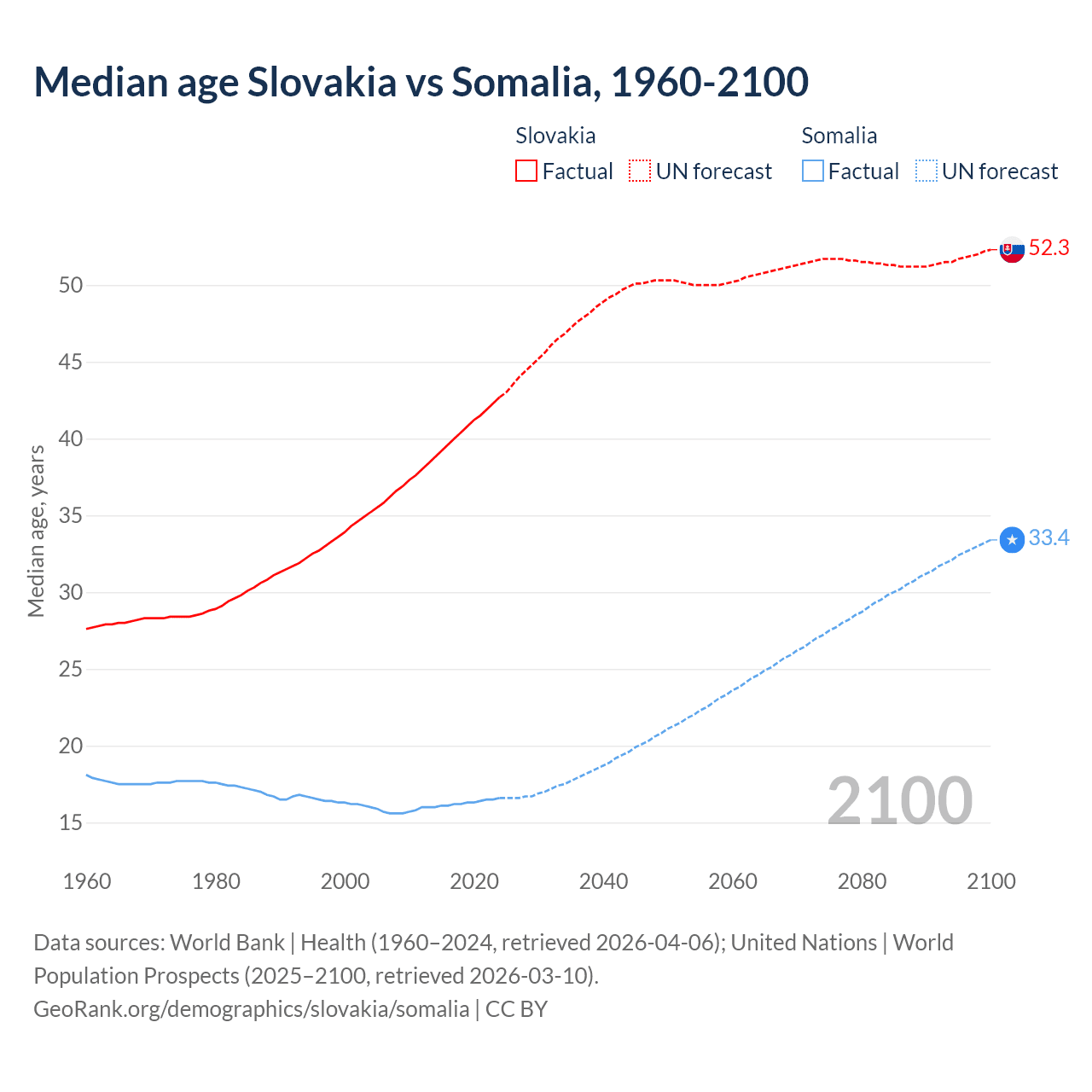 Median age Slovakia vs Somalia, 1960-2100
