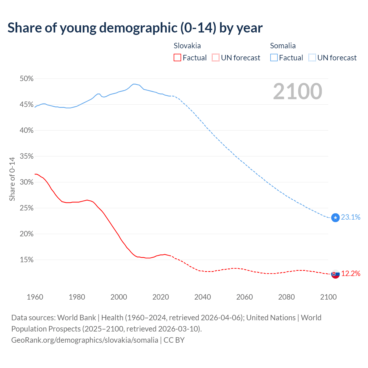 - The share of young demographic (0-15 years old) in Slovakia is 15.8% vs 46.6% in Somalia.