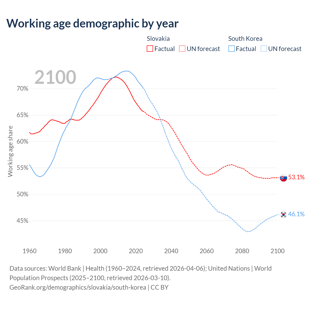 Median age Slovakia vs South Korea, 1960-2100