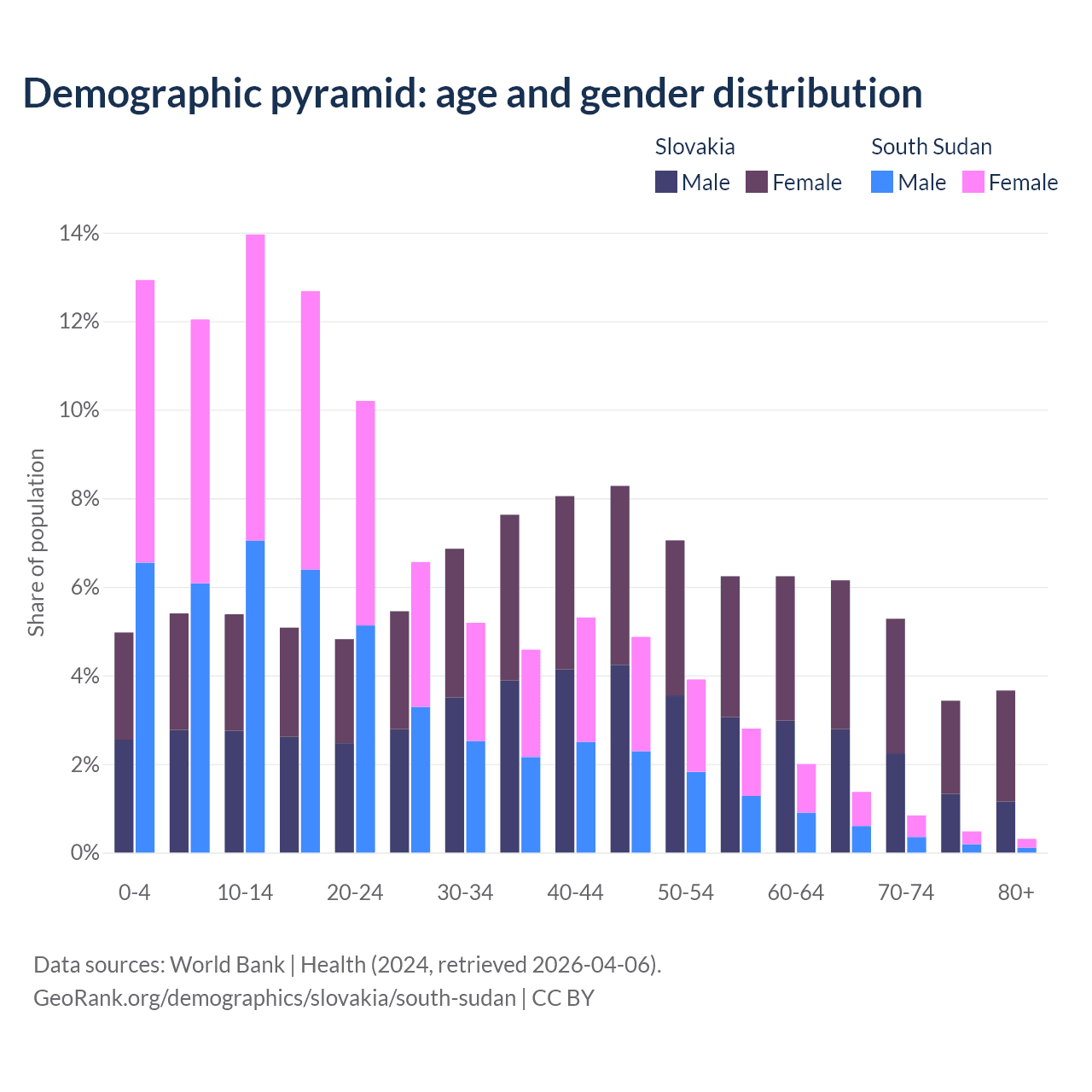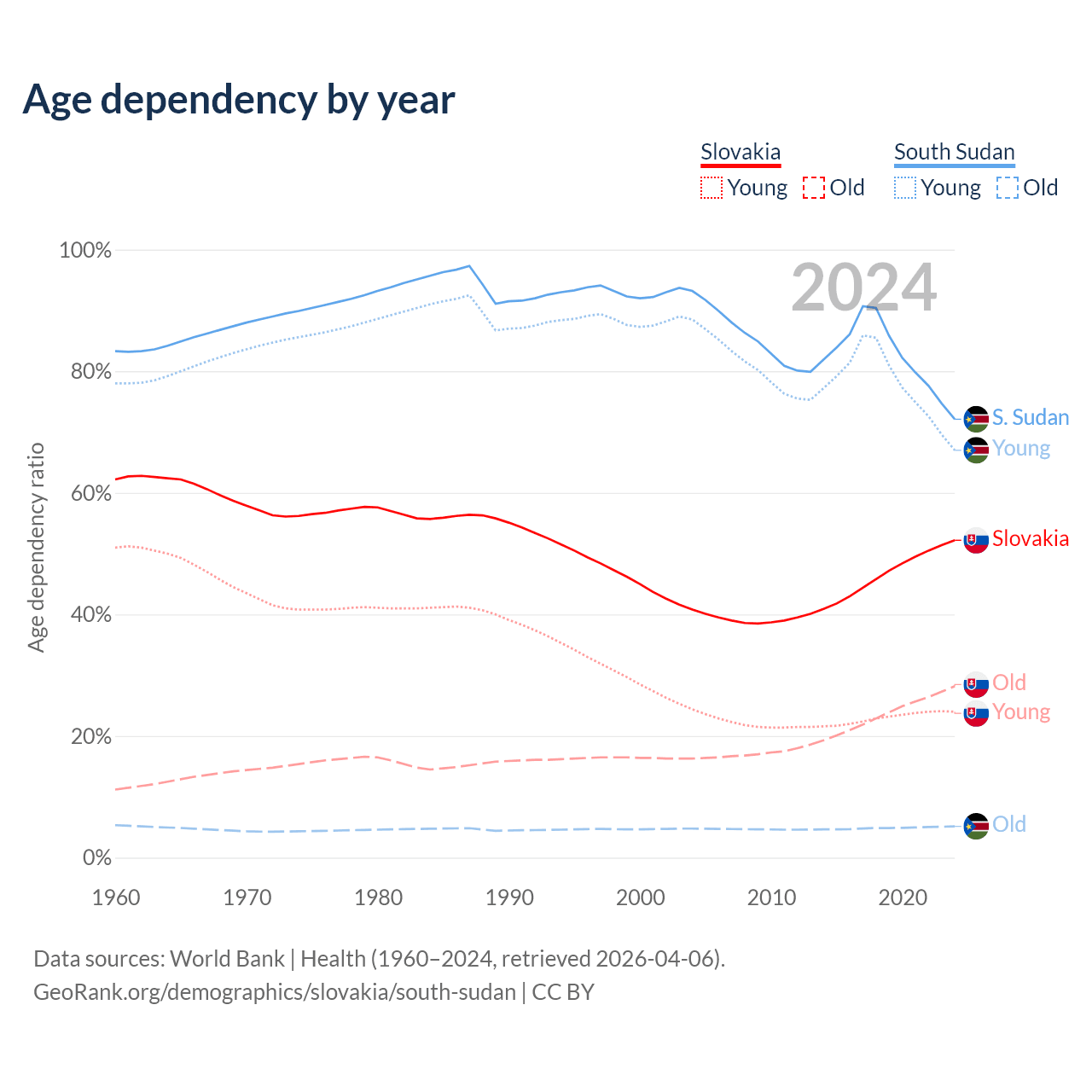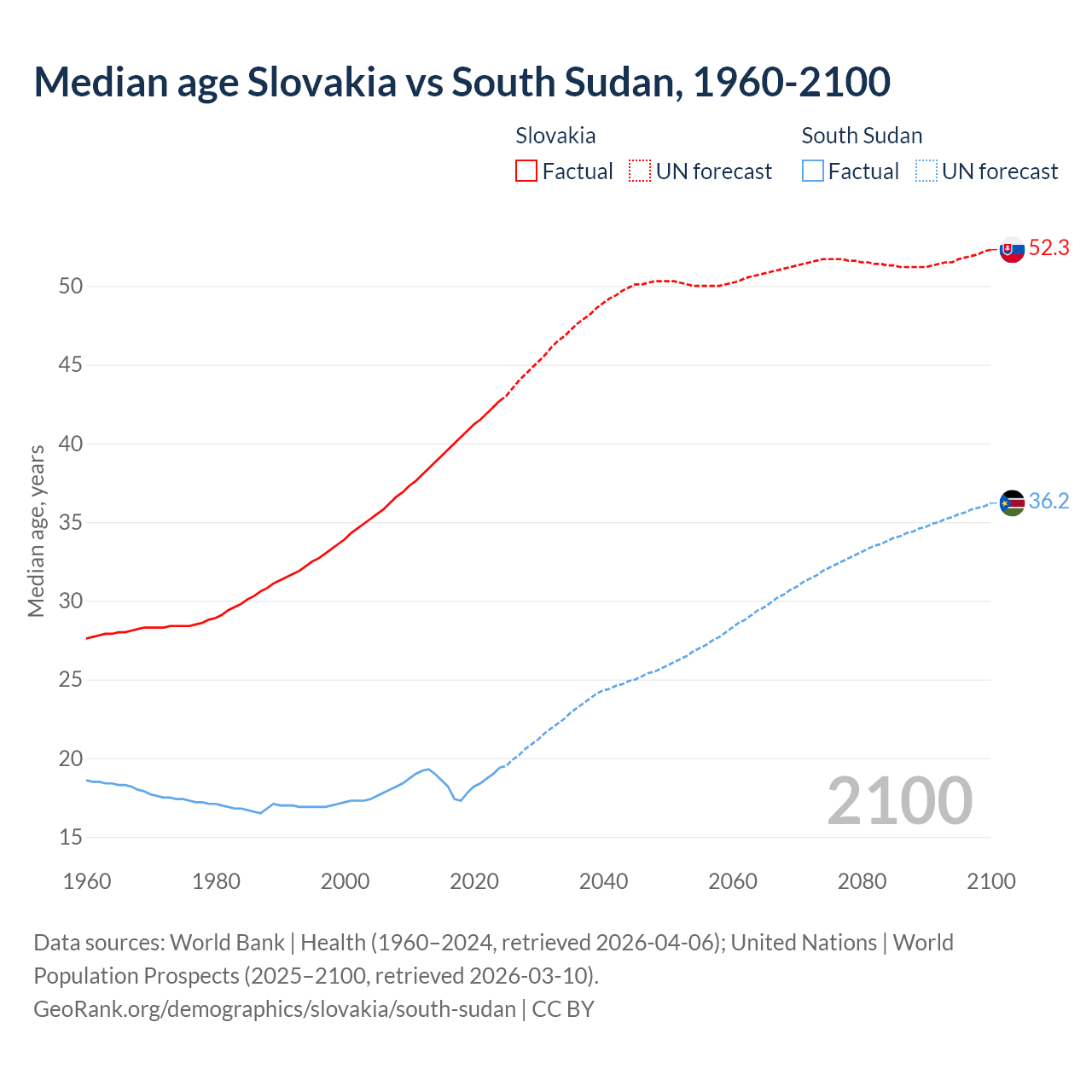 - Slovakia is ranked 31/196 by median age (oldest to youngest) vs 173/196 for South Sudan.