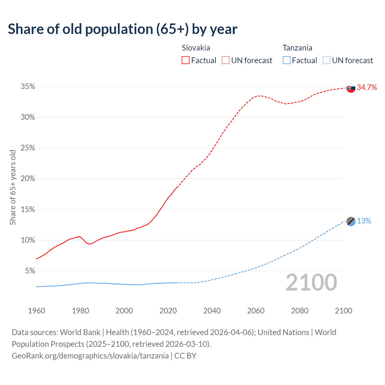 The share of older people aged 65 and over is 18.5% in Slovakia and 3.05% in Tanzania. Life expectancy in Slovakia compared to Tanzania .