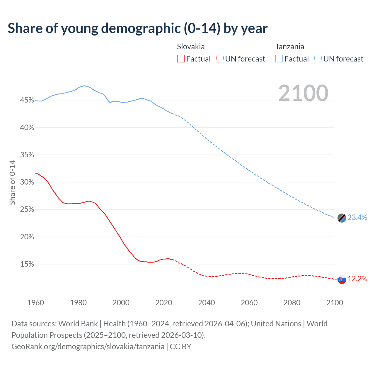 - The share of young demographic (0-15 years old) in Slovakia is 15.8% vs 42.5% in Tanzania.