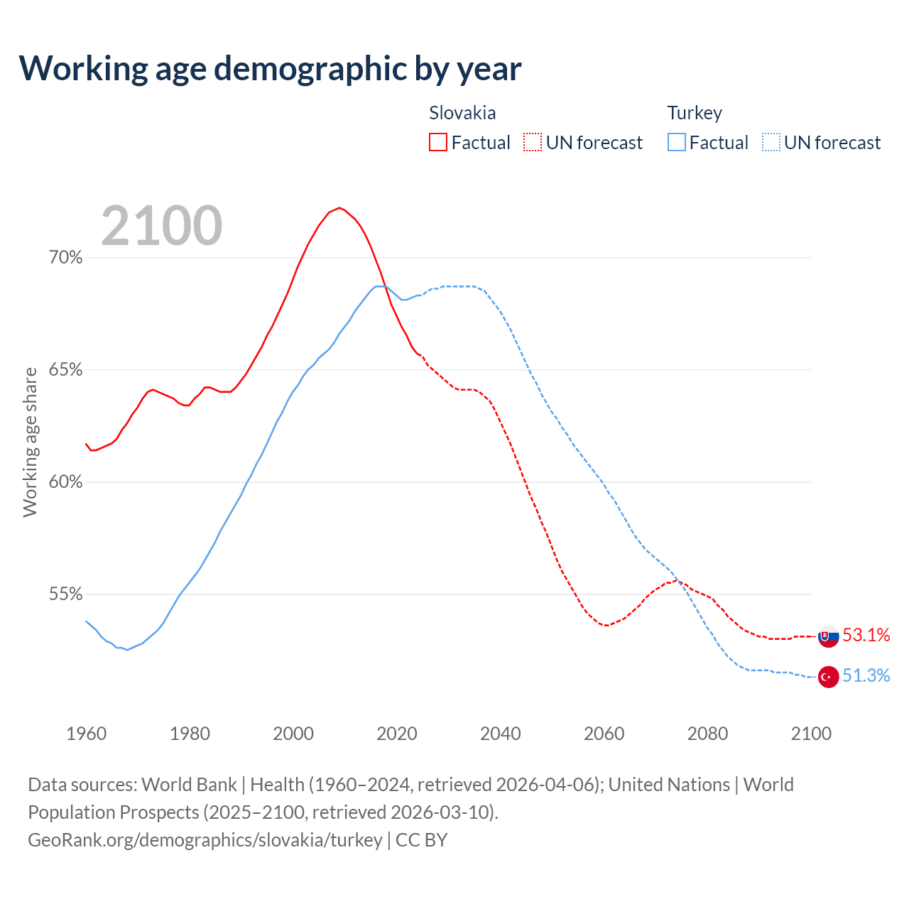 Median age Slovakia vs Turkey, 1960-2100
