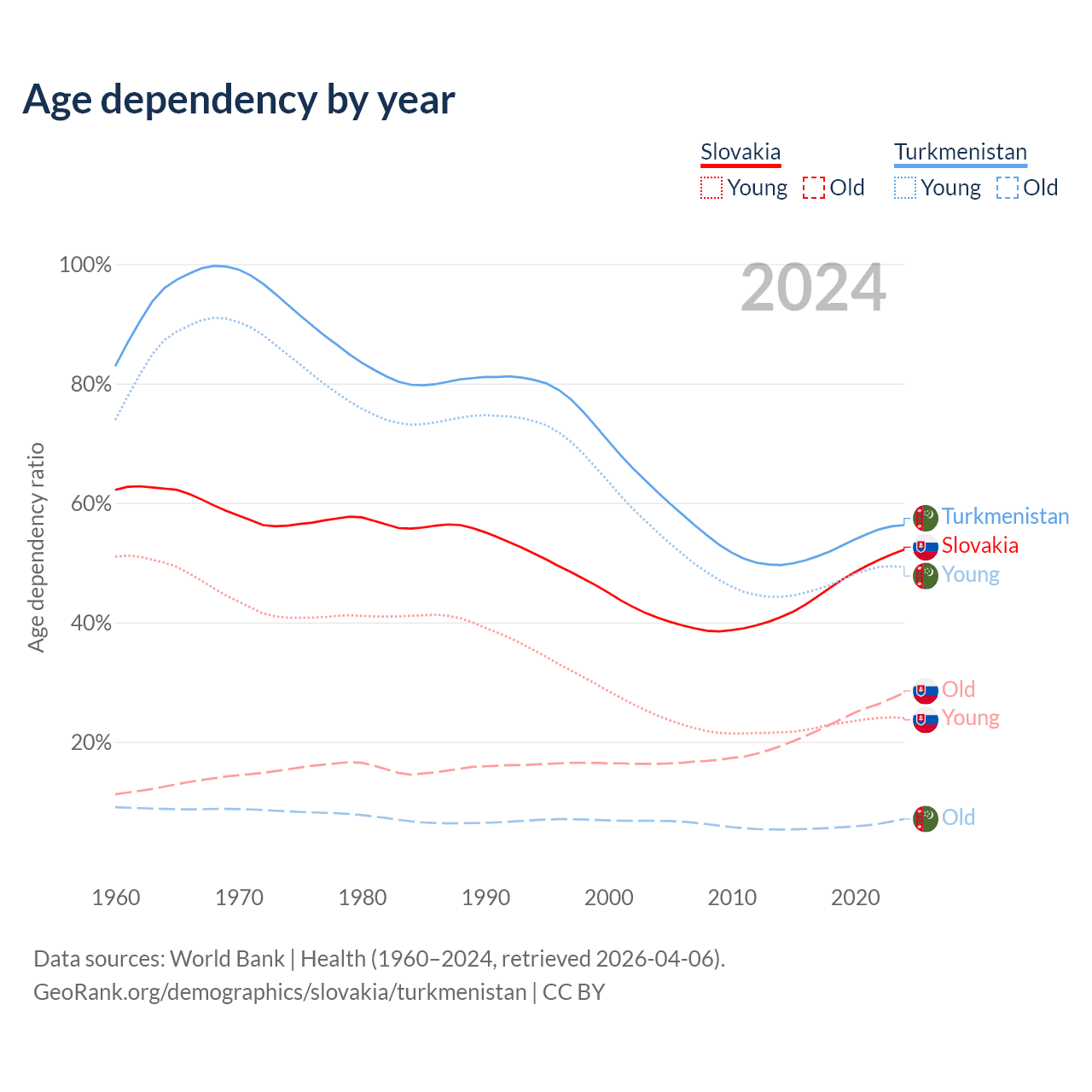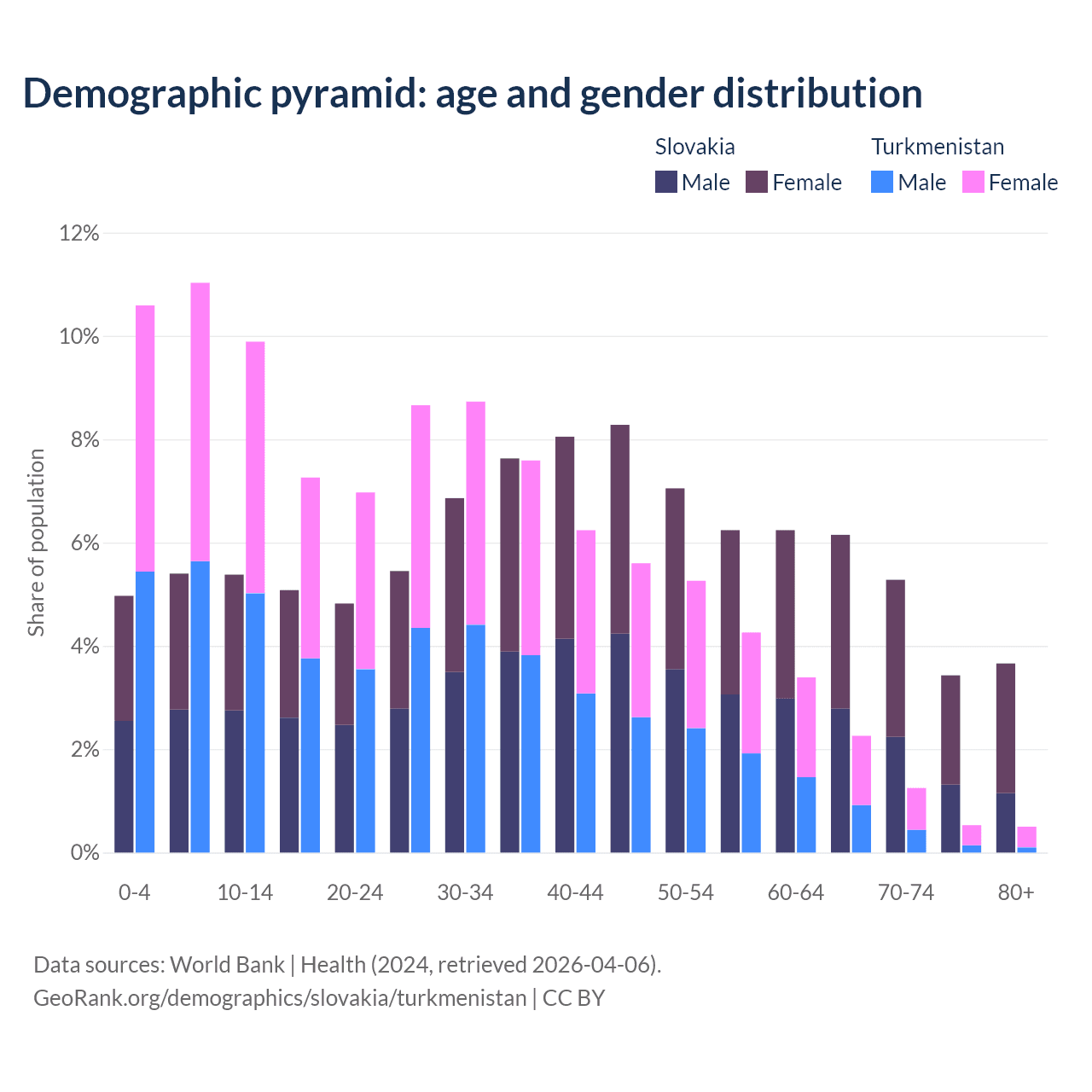 - Slovakia is ranked 31/196 by median age (oldest to youngest) vs 119/196 for Turkmenistan.