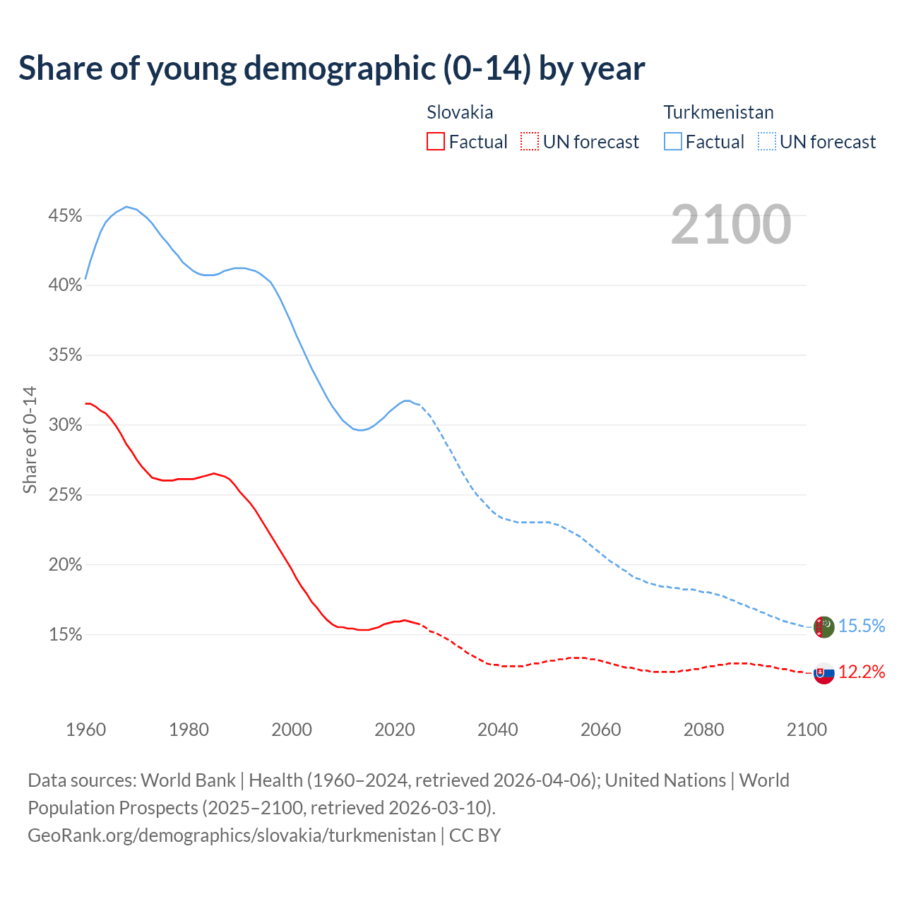 - The share of young demographic (0-15 years old) in Slovakia is 15.8% vs 31.5% in Turkmenistan.