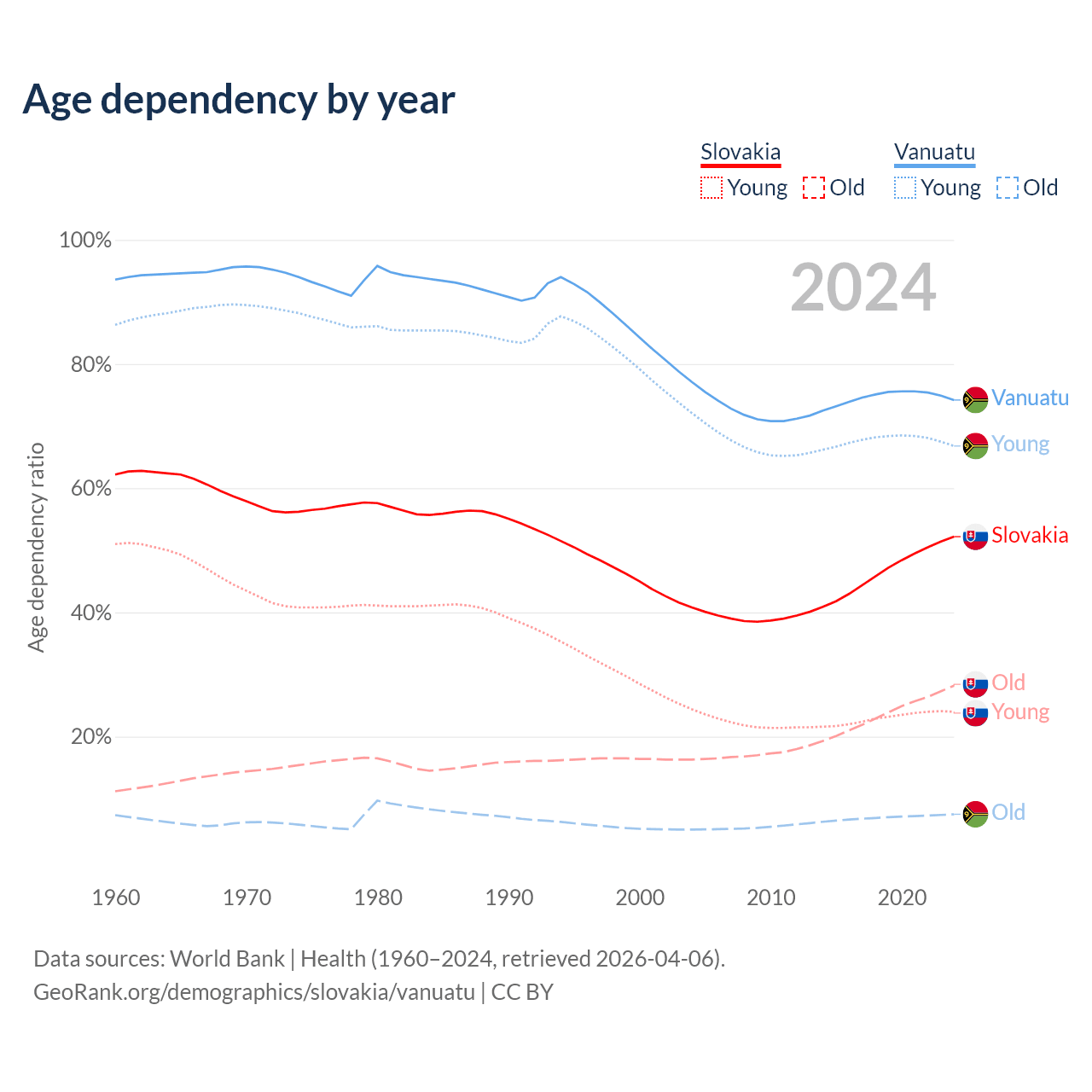 - The share of old-age demographic (65+) in Slovakia is 18.5% vs 4.3% in Vanuatu.