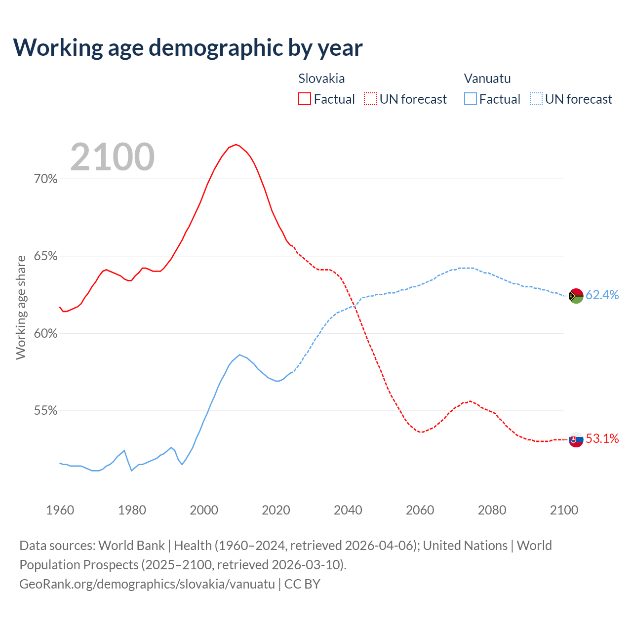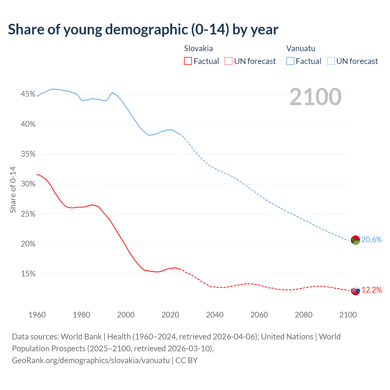 - The share of young demographic (0-15 years old) in Slovakia is 15.8% vs 38.3% in Vanuatu.