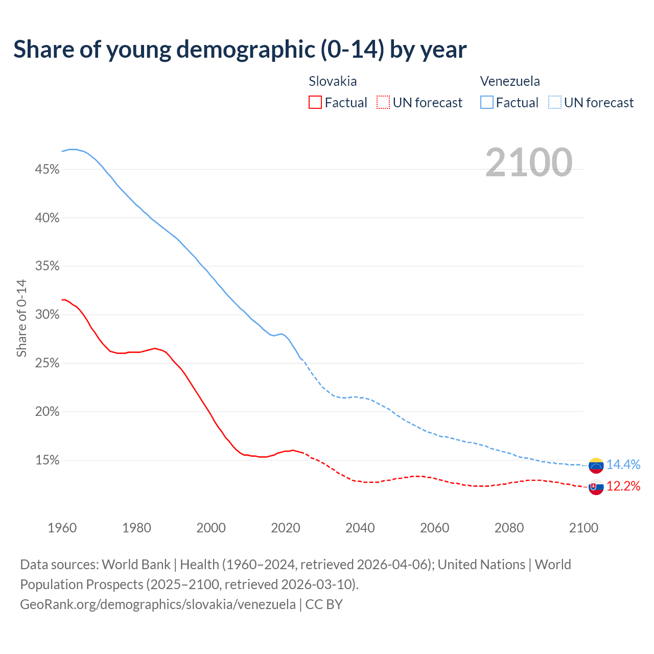 - The share of young demographic (0-15 years old) in Slovakia is 15.8% vs 25.5% in Venezuela.