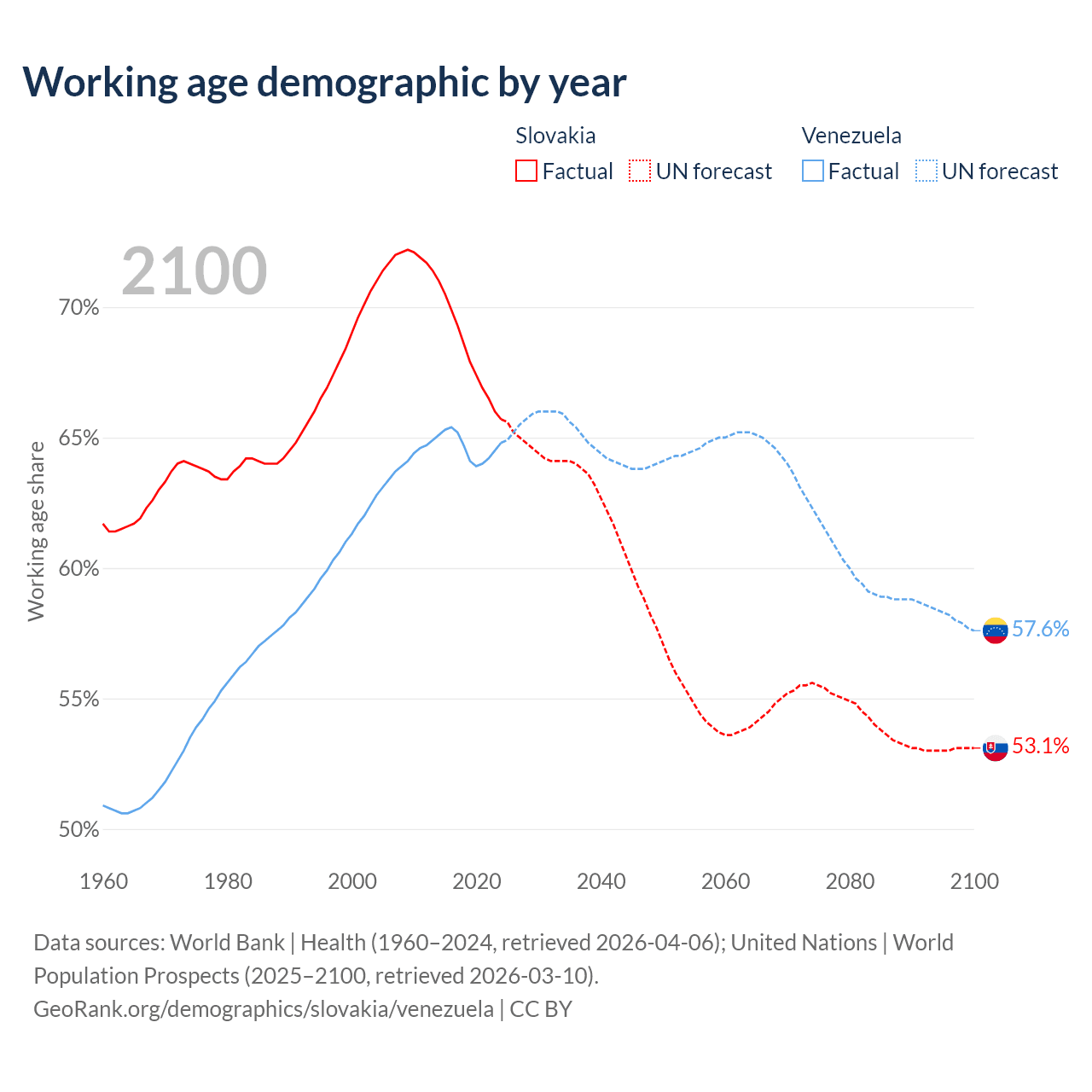 Median age Slovakia vs Venezuela, 1960-2100