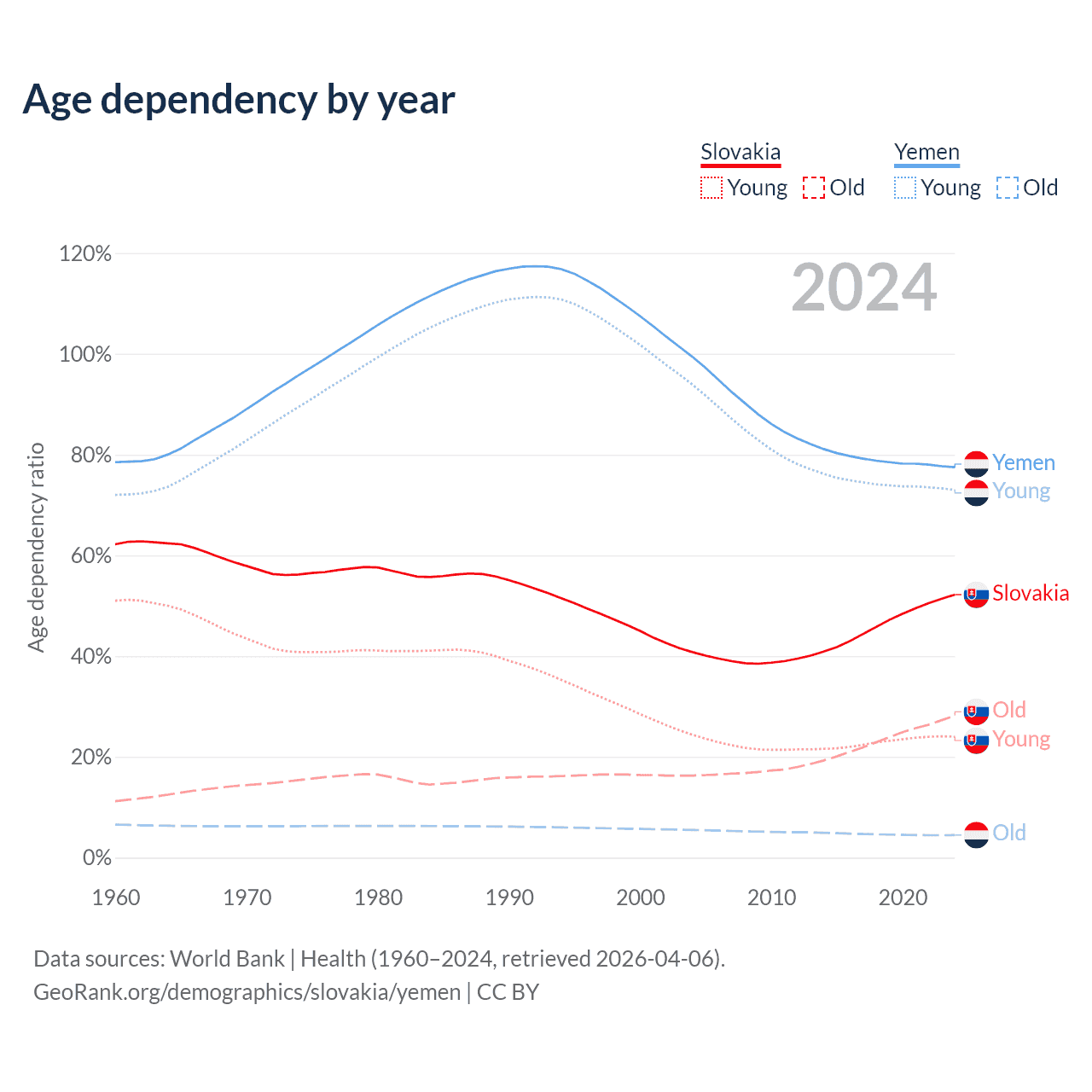 The share of older people aged 65 and over is 18.5% in Slovakia and 2.52% in Yemen. Life expectancy in Slovakia compared to Yemen .