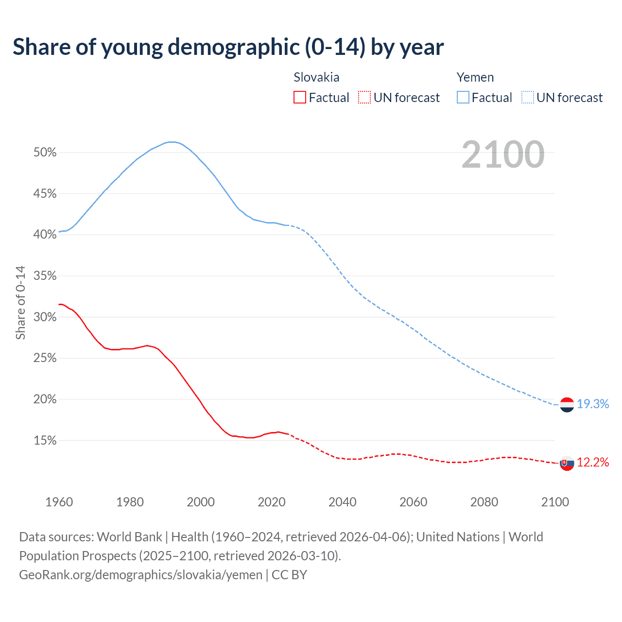 - The share of young demographic (0-15 years old) in Slovakia is 15.8% vs 41.1% in Yemen.