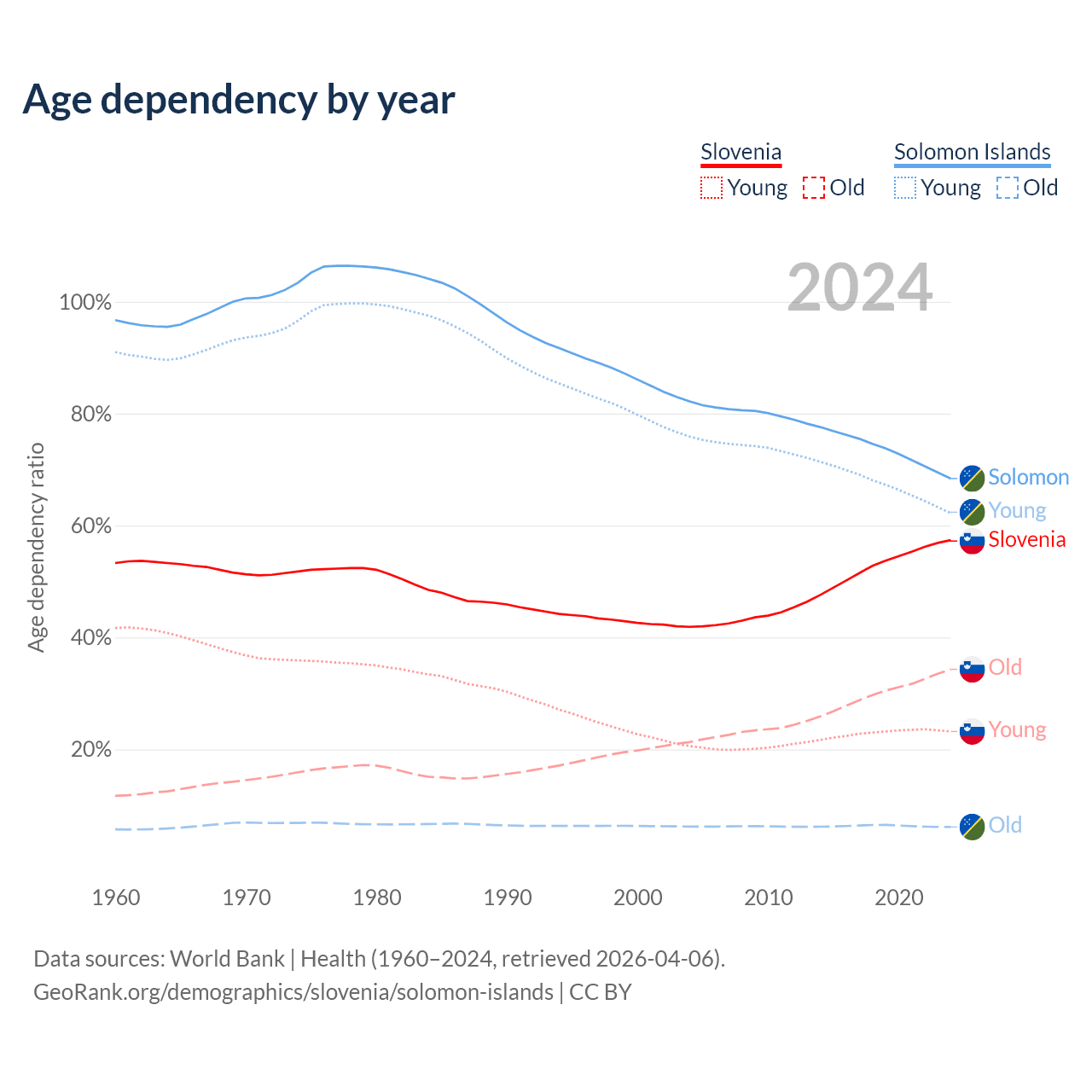 - Slovenia is ranked 14/196 by median age (oldest to youngest) vs 153/196 for the Solomon Islands.