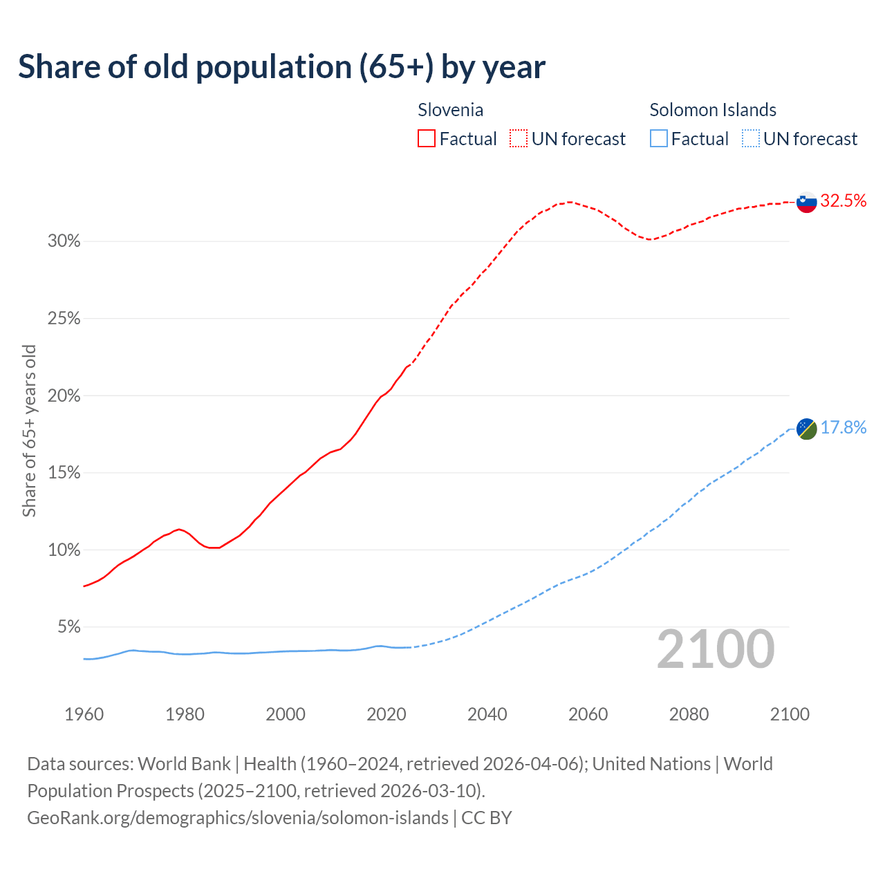 - The share of old-age demographic (65+) in Slovenia is 21.8% vs 3.64% in the Solomon Islands.