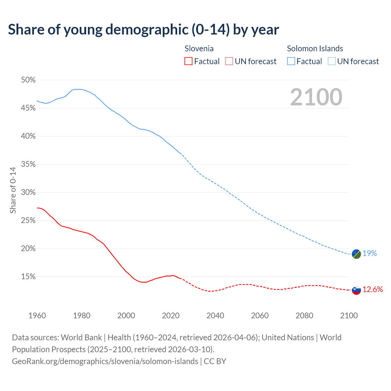 - The share of young demographic (0-15 years old) in Slovenia is 14.7% vs 37% in the Solomon Islands.