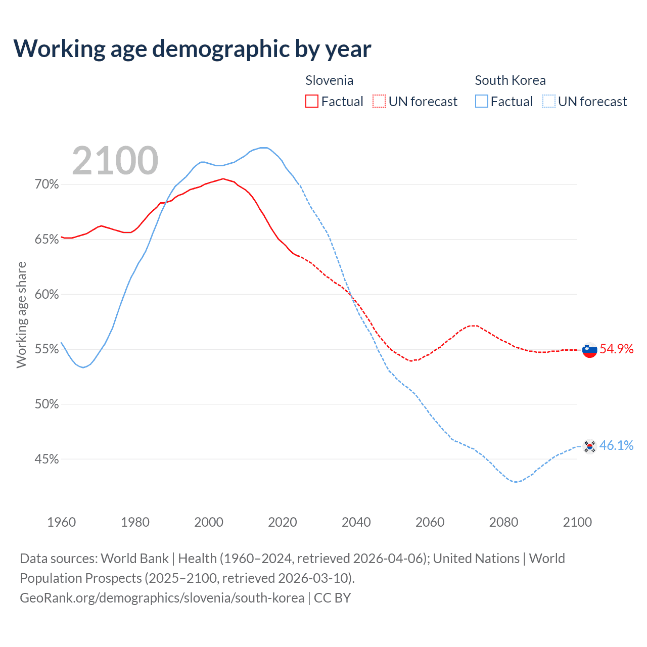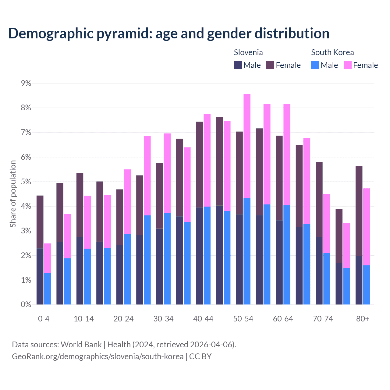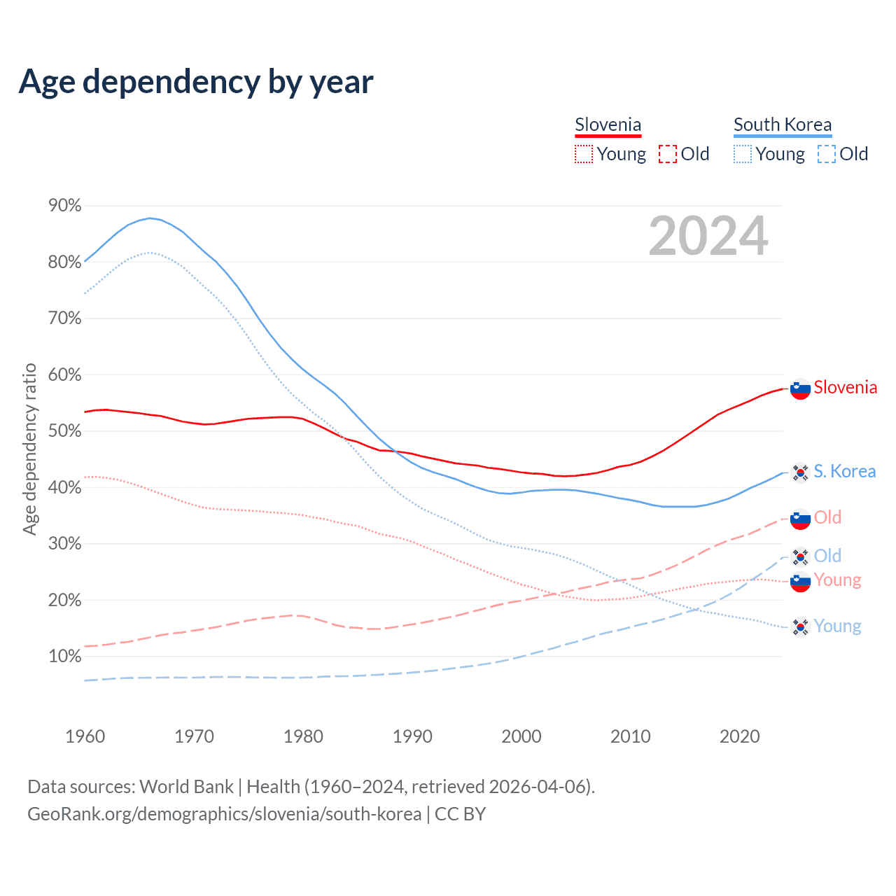 - Slovenia is ranked 14/196 by median age (oldest to youngest) vs 10/196 for South Korea.