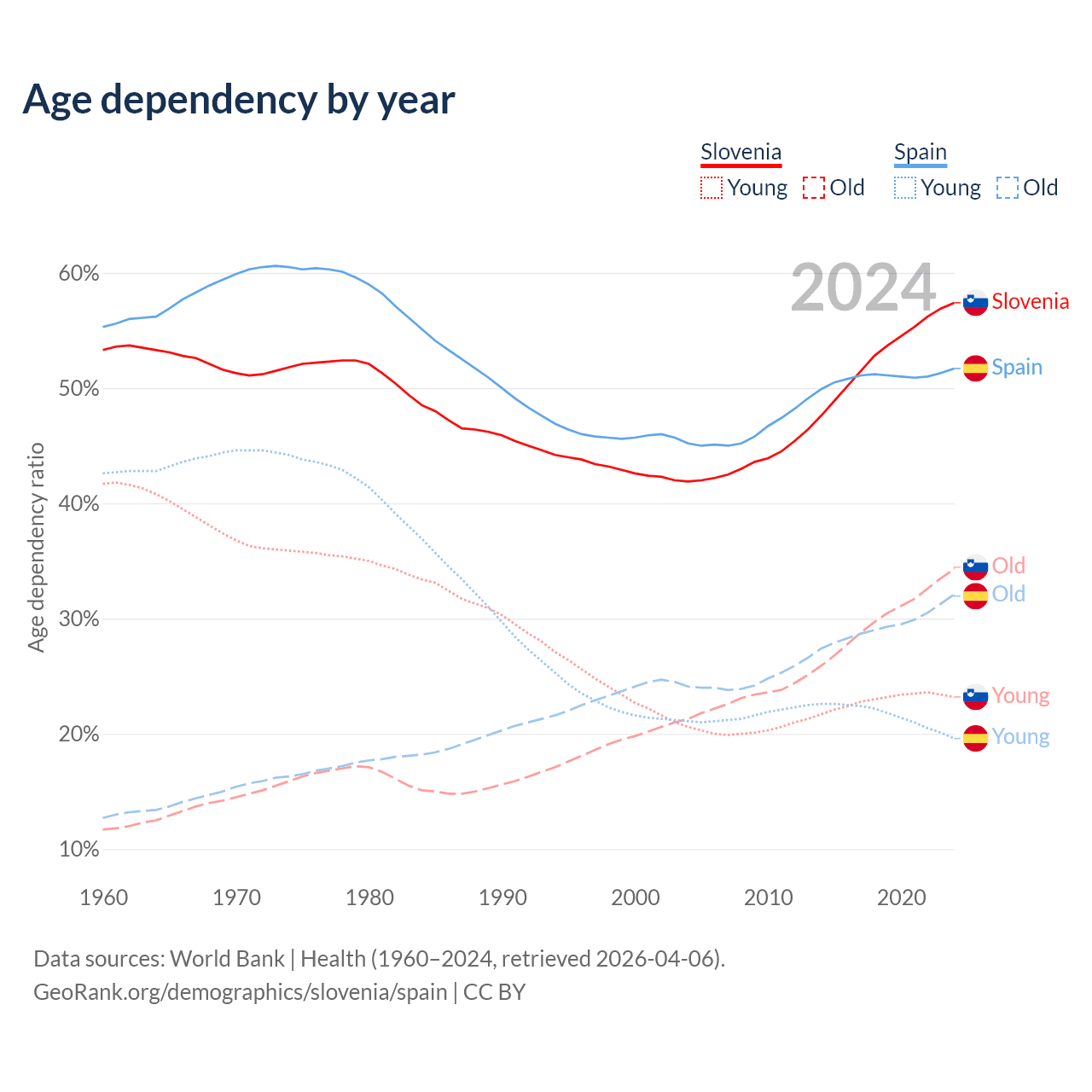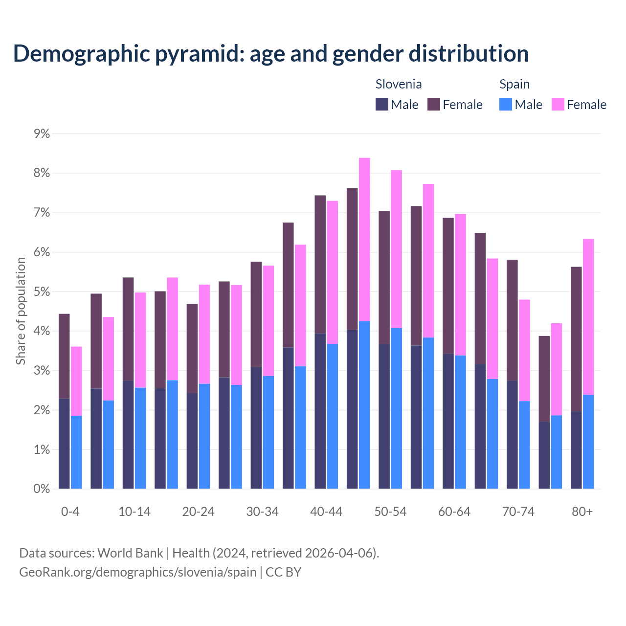 - Slovenia is ranked 14/196 by median age (oldest to youngest) vs 7/196 for Spain.