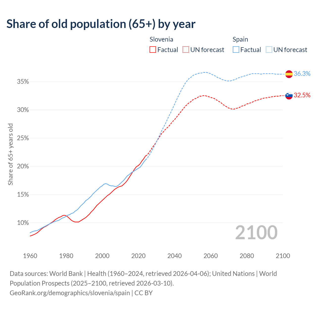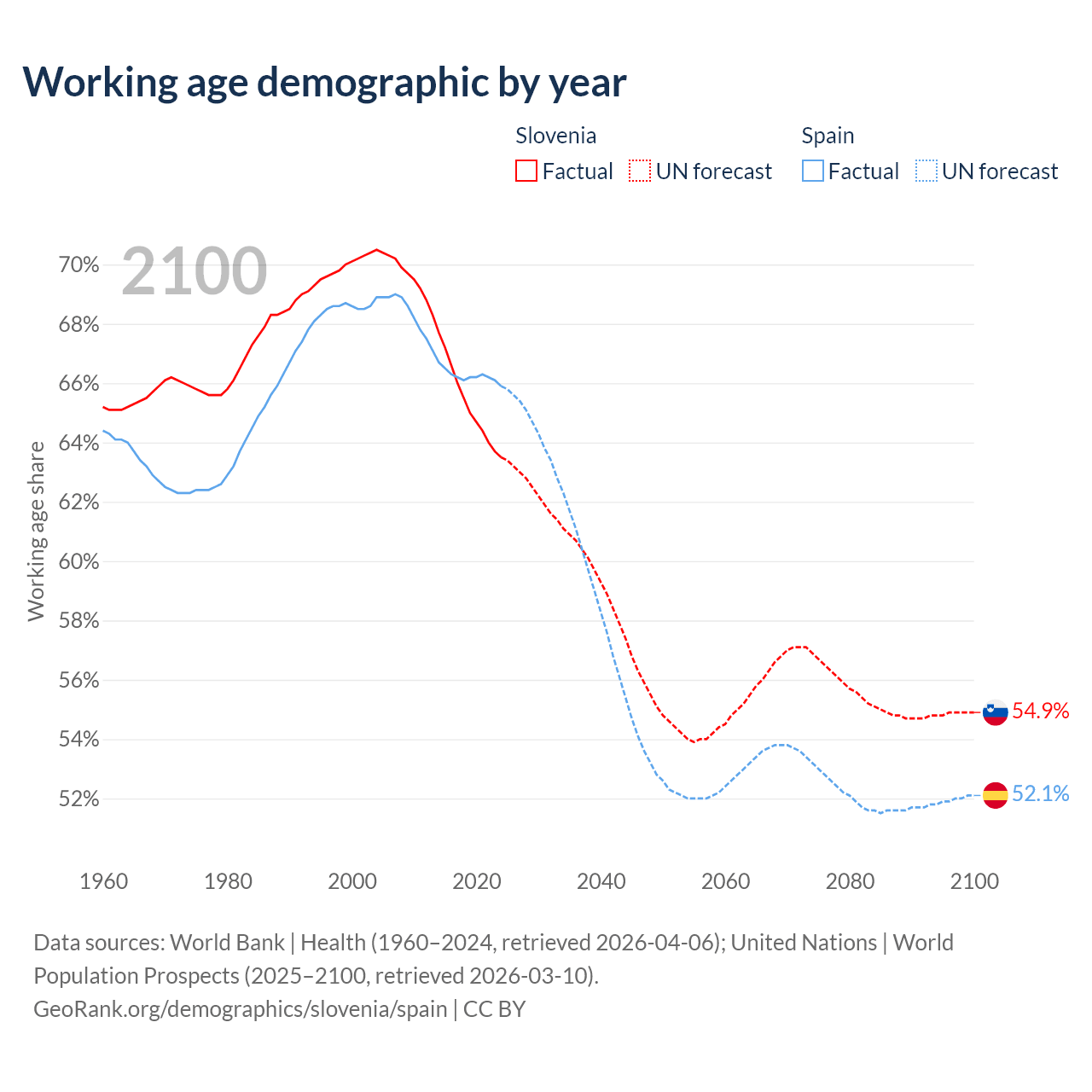Median age Slovenia vs Spain, 1960-2100