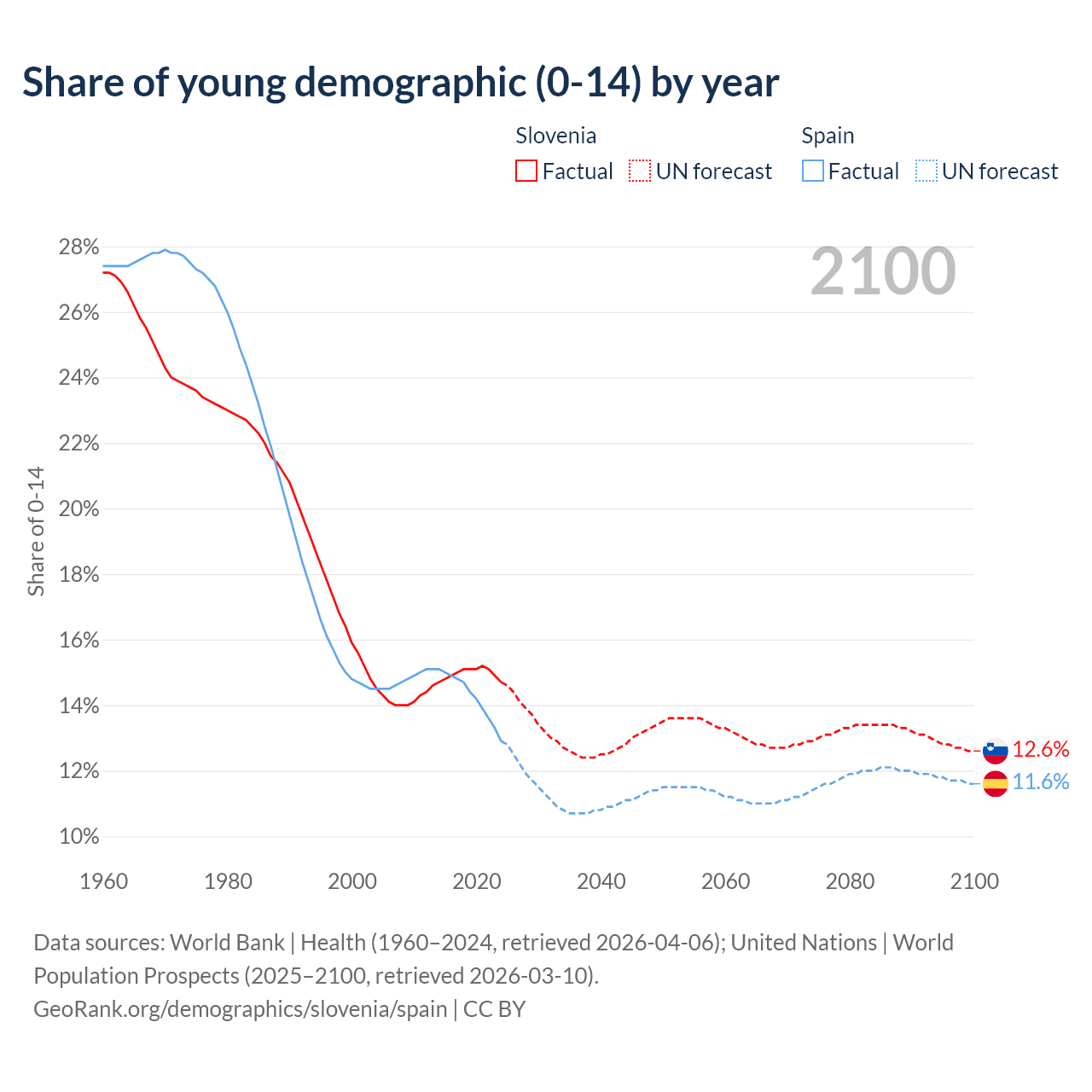 - The share of young demographic (0-15 years old) in Slovenia is 14.7% vs 12.9% in Spain.