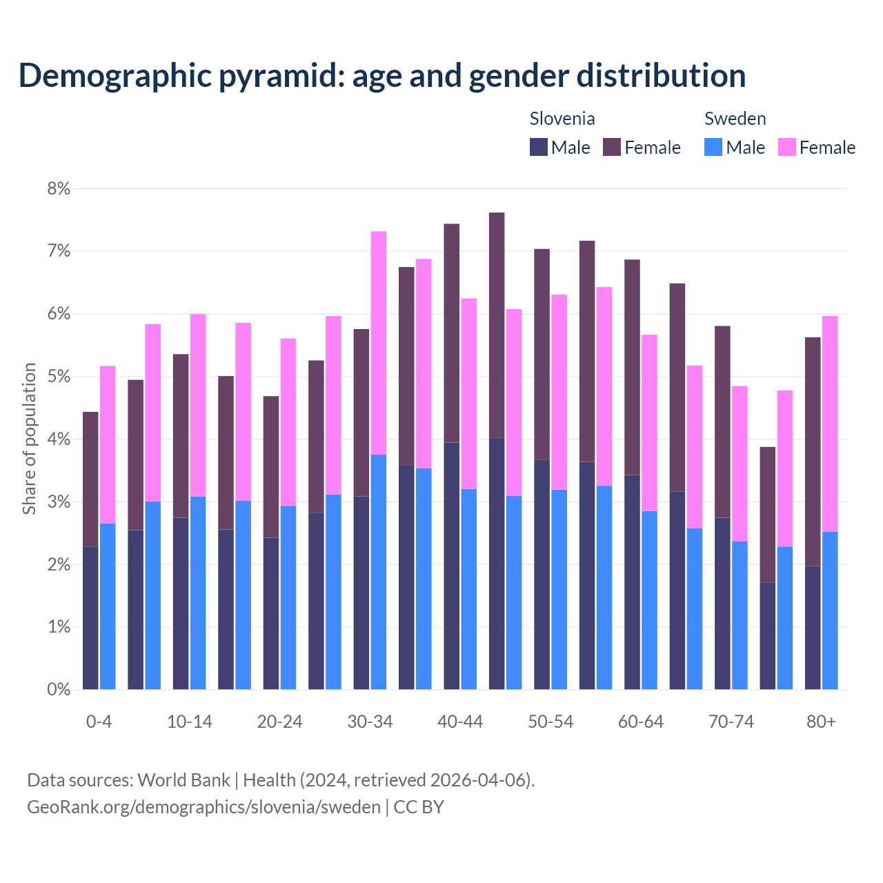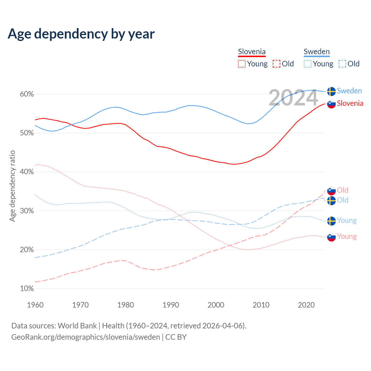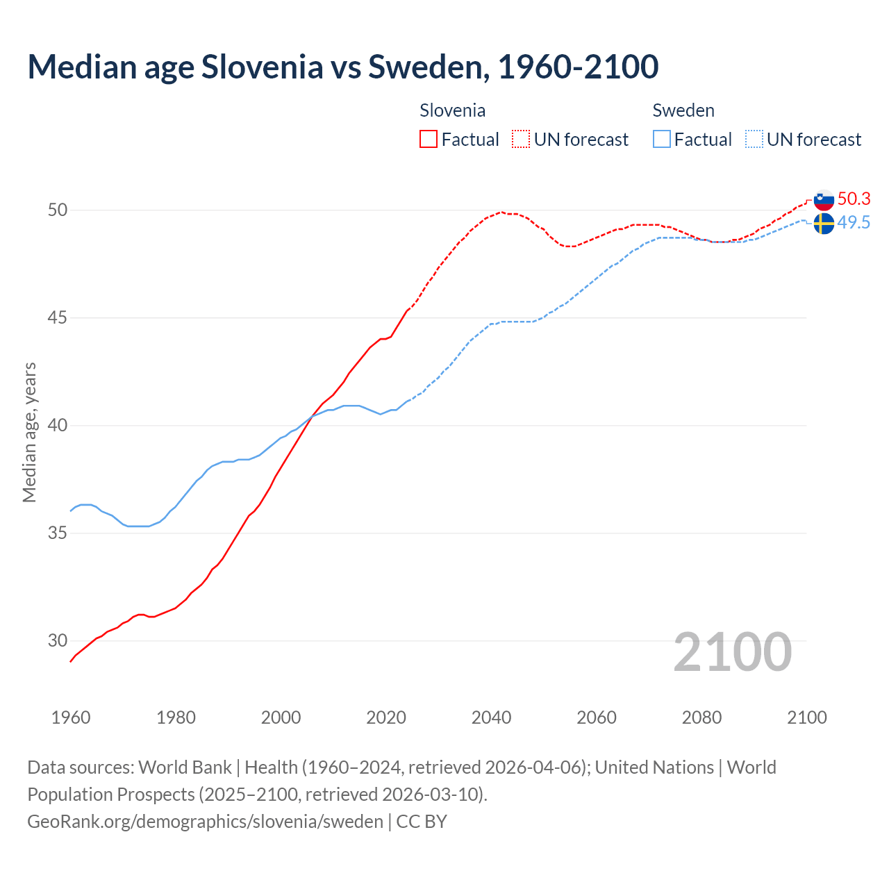 - Slovenia is ranked 14/196 by median age (oldest to youngest) vs 39/196 for Sweden.