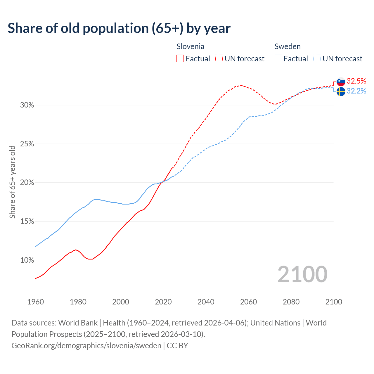 - The share of old-age demographic (65+) in Slovenia is 21.8% vs 20.7% in Sweden.