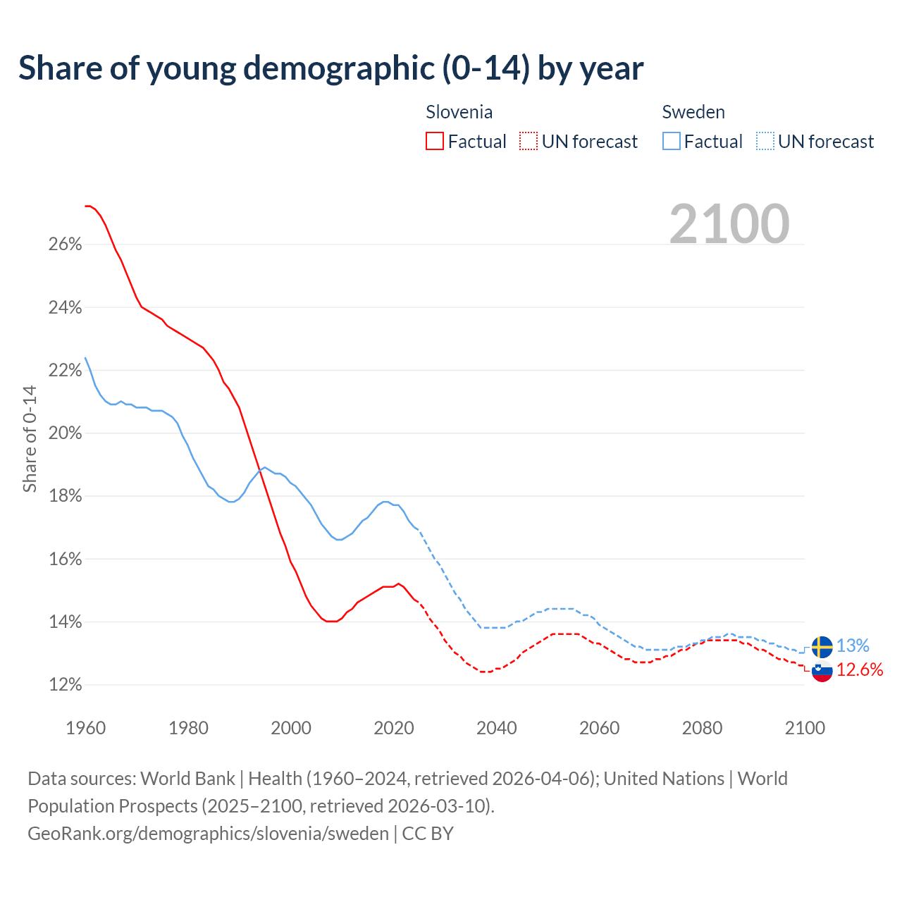 - The share of young demographic (0-15 years old) in Slovenia is 14.7% vs 17% in Sweden.