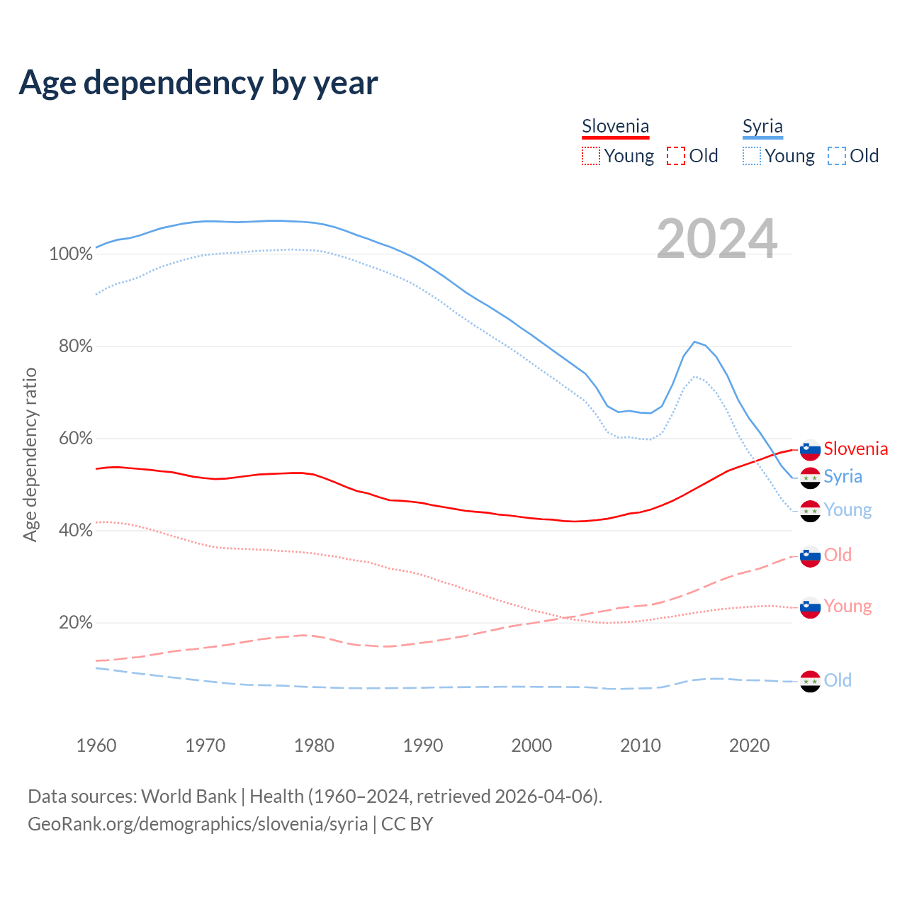 - The share of old-age demographic (65+) in Slovenia is 21.8% vs 4.74% in Syria.