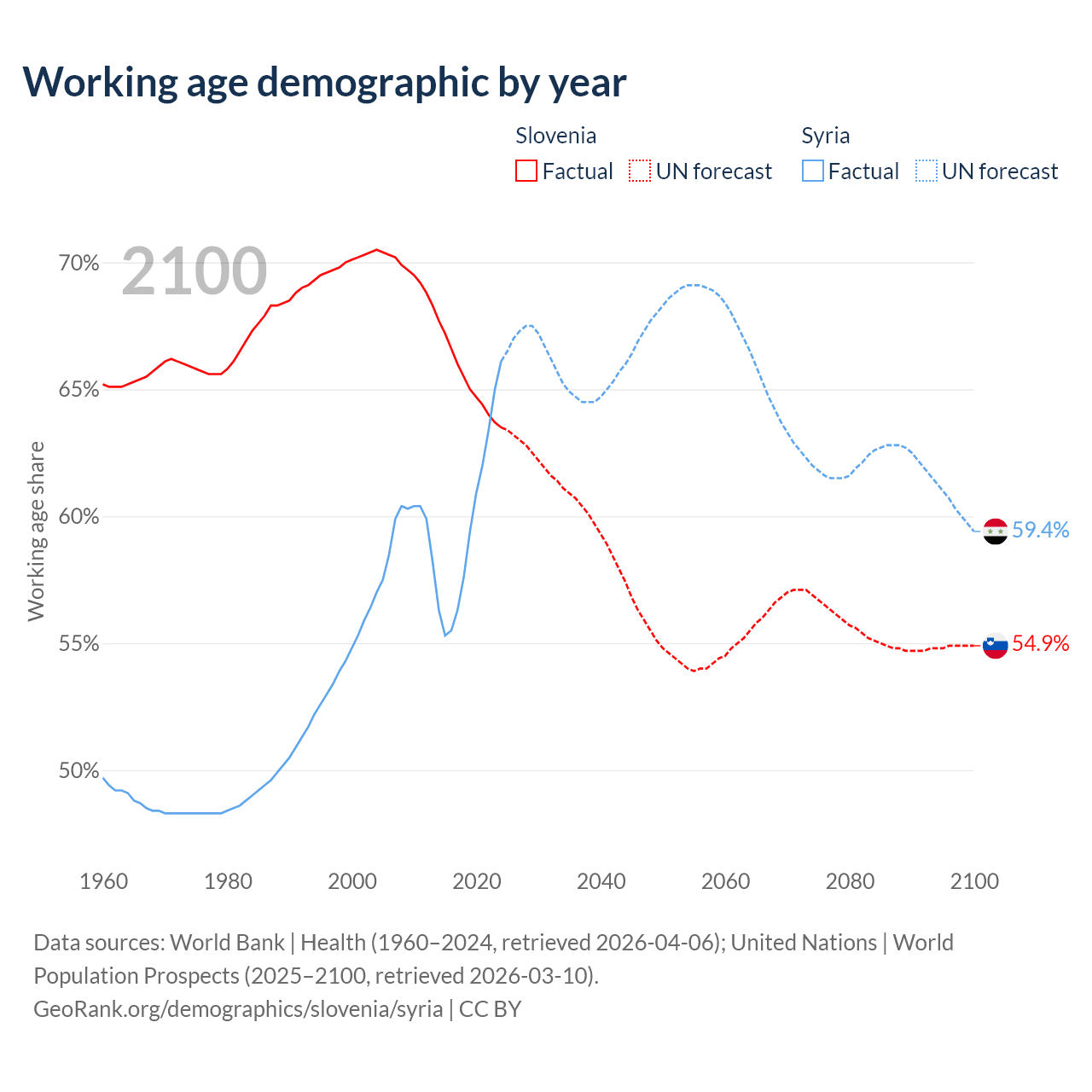 Median age Slovenia vs Syria, 1960-2100
