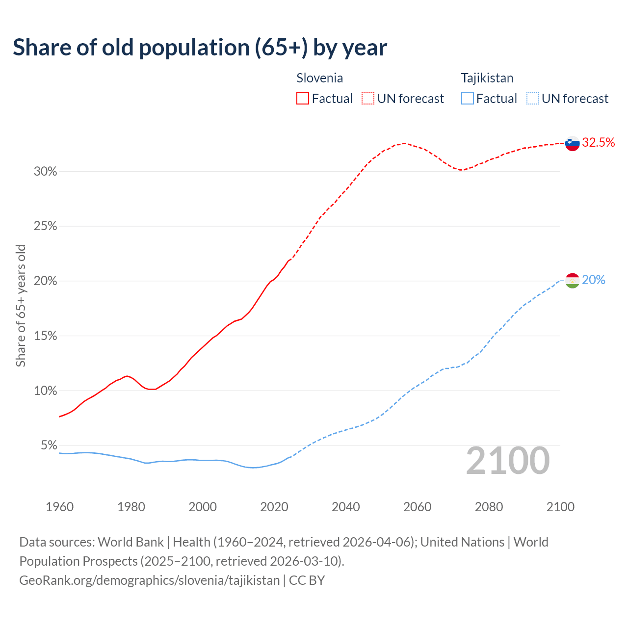 - The share of old-age demographic (65+) in Slovenia is 21.8% vs 3.85% in Tajikistan.