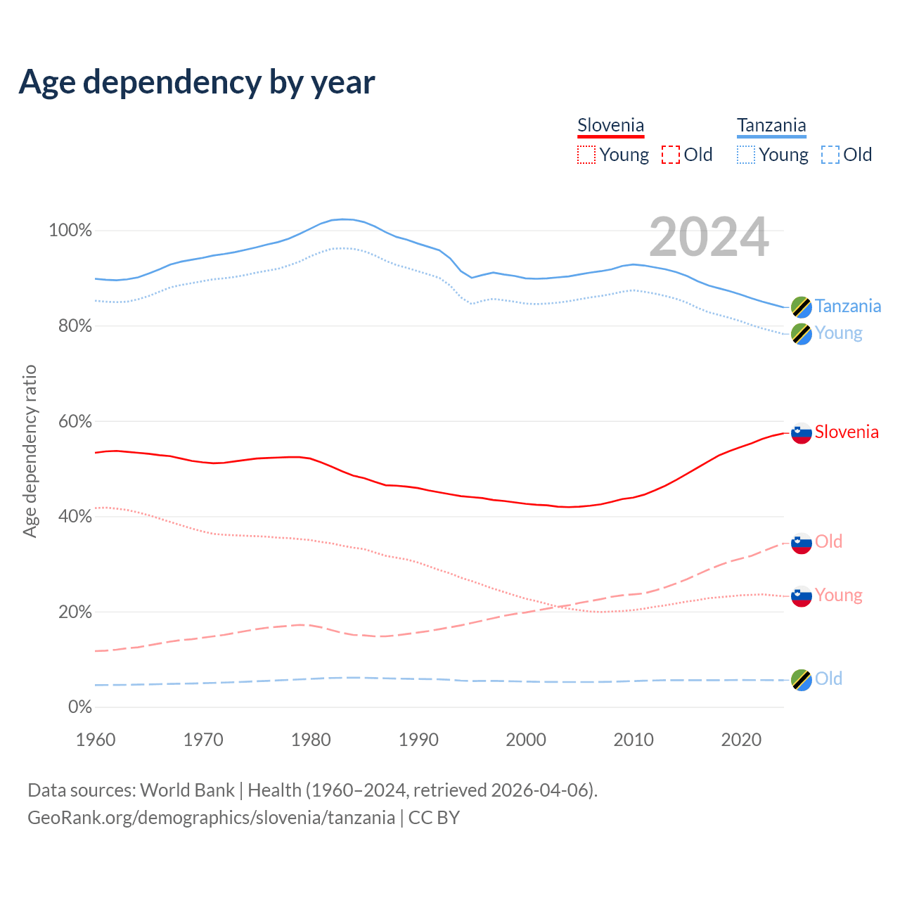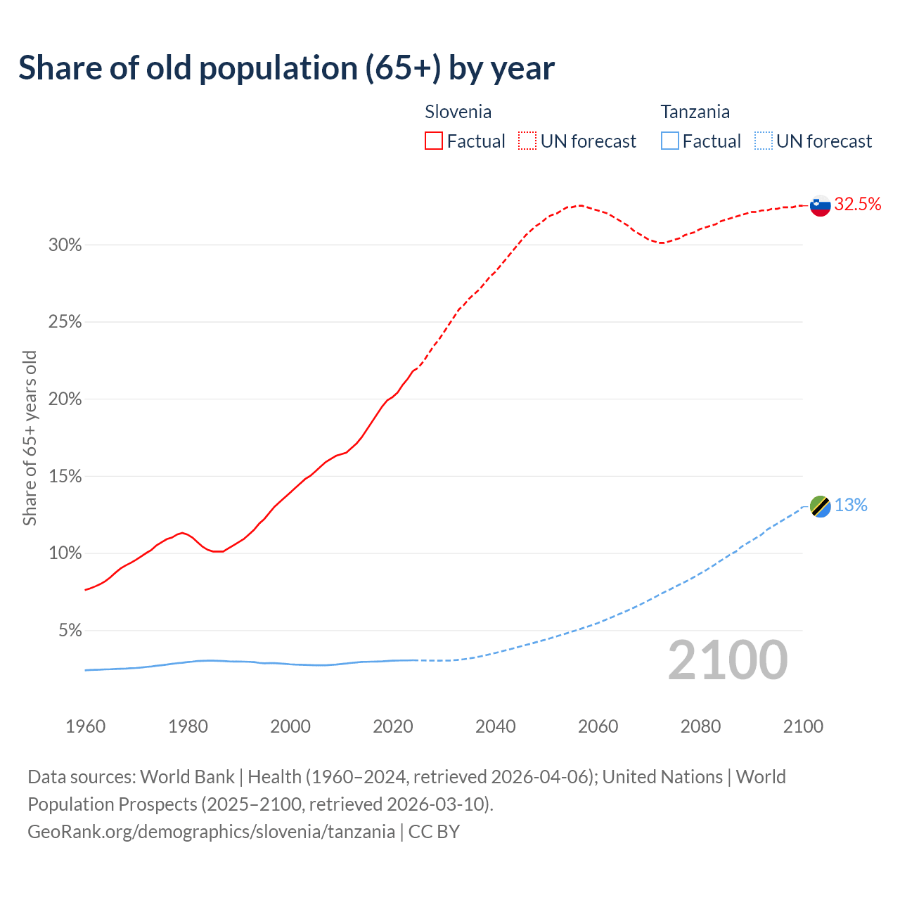 - The share of old-age demographic (65+) in Slovenia is 21.8% vs 3.05% in Tanzania.