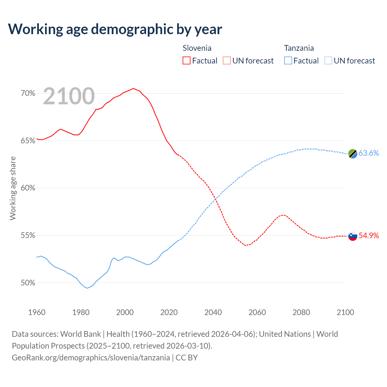 - Slovenia has 1.35M working age adults (aged 15-64) vs 39.8M in Tanzania.
