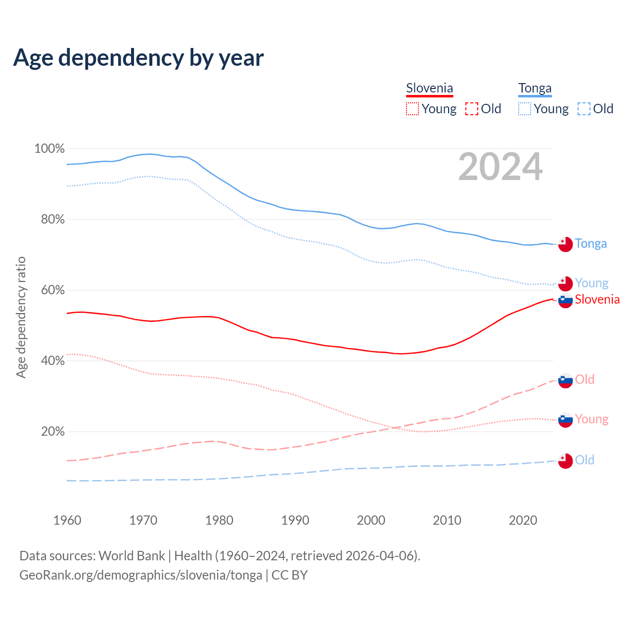 The share of older people aged 65 and over is 21.8% in Slovenia and 6.72% in Tonga. Life expectancy in Slovenia compared to Tonga .