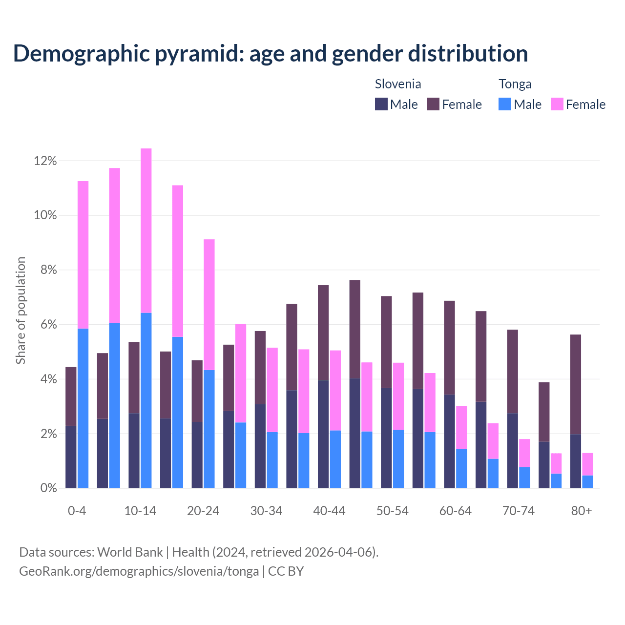 - As of 2026, the population of Slovenia is 2.12M vs 103K in Tonga - 20.6 times difference.