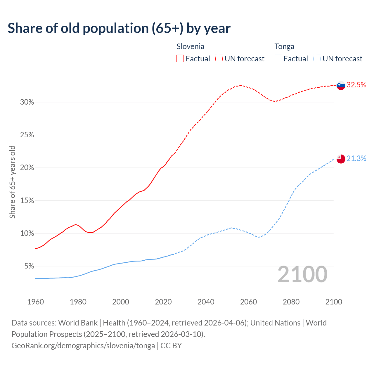 - The share of old-age demographic (65+) in Slovenia is 21.8% vs 6.72% in Tonga.