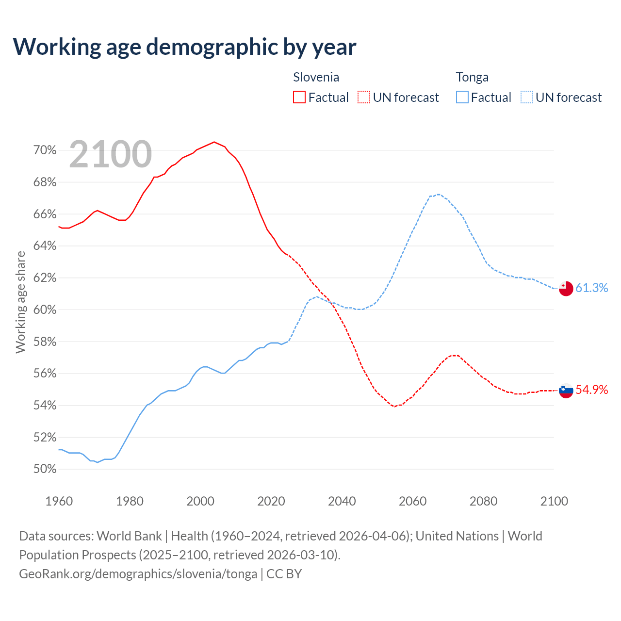 - Slovenia has 1.35M working age adults (aged 15-64) vs 59.8K in Tonga.