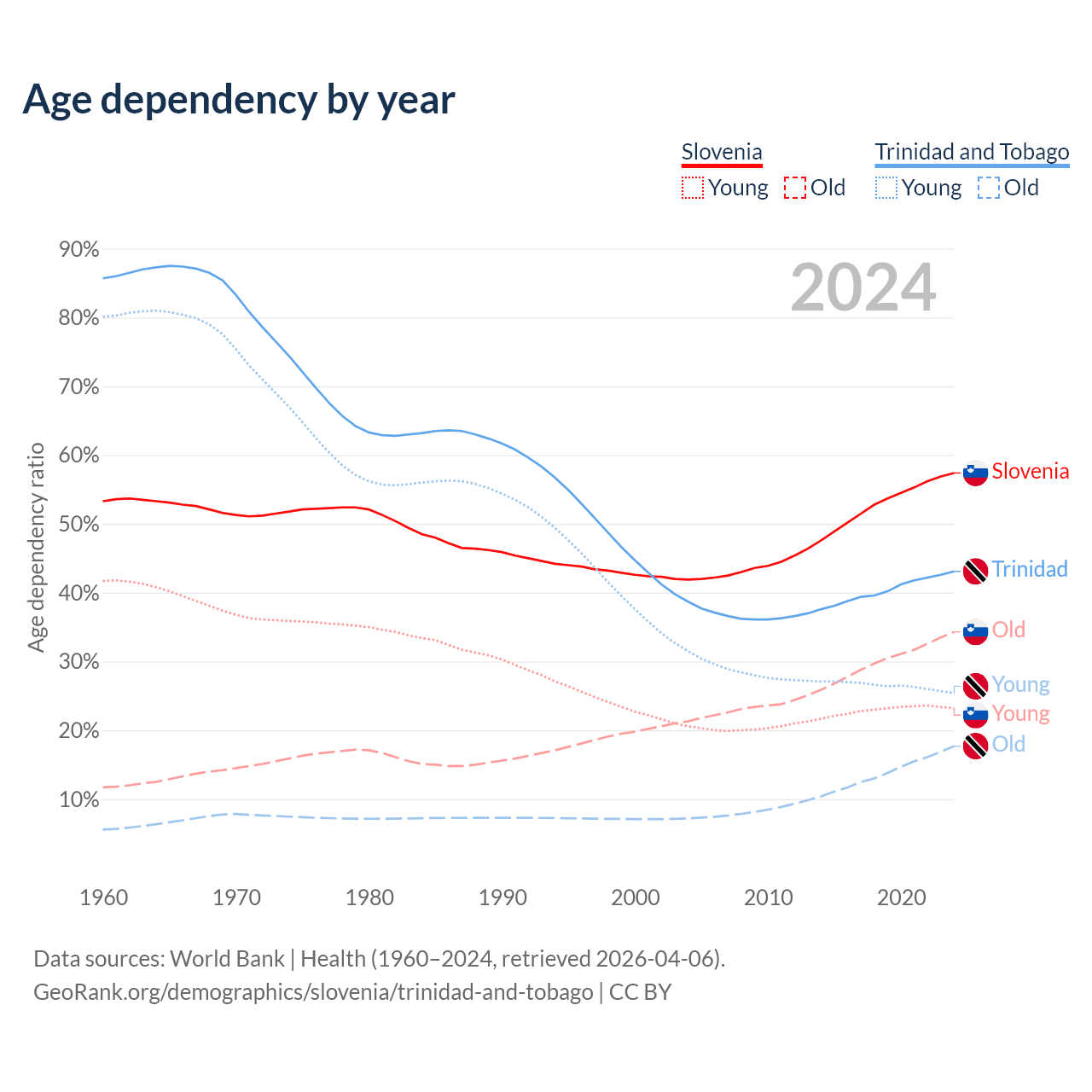 - The share of old-age demographic (65+) in Slovenia is 21.8% vs 12.4% in Trinidad and Tobago.
