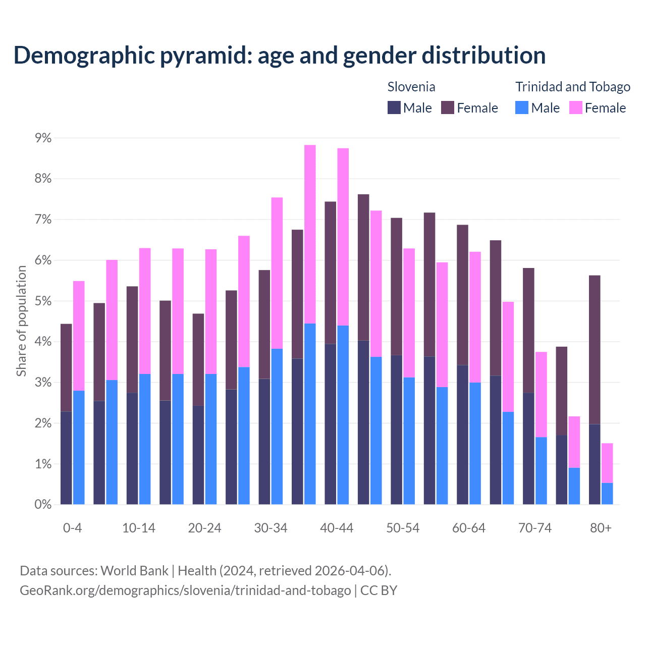 - Slovenia is ranked 14/196 by median age (oldest to youngest) vs 58/196 for Trinidad and Tobago.