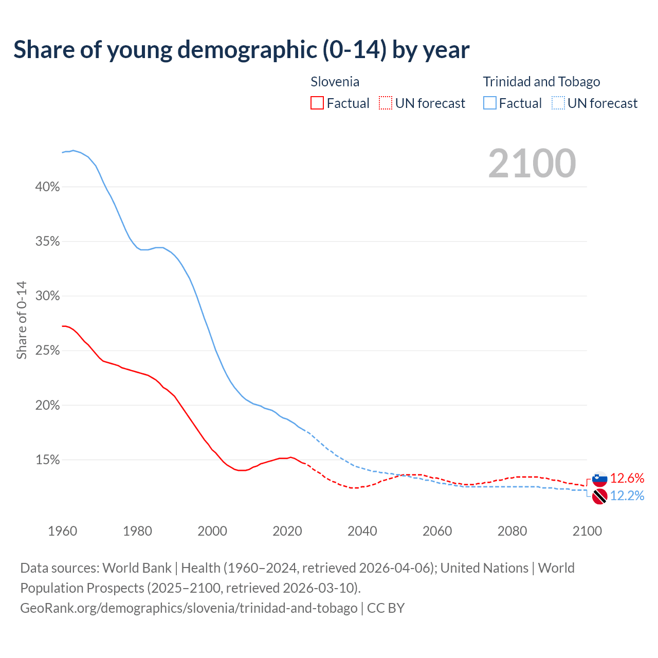 - The share of young demographic (0-15 years old) in Slovenia is 14.7% vs 17.8% in Trinidad and Tobago.