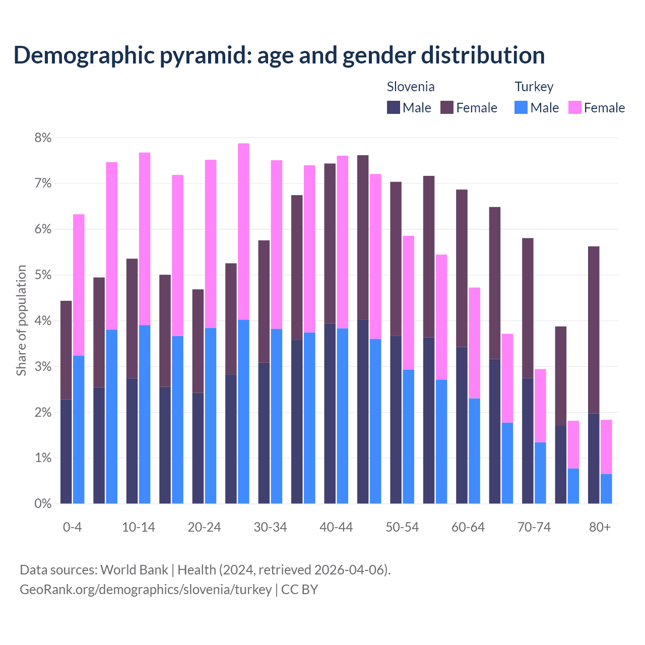 The share of older people aged 65 and over is 21.8% in Slovenia and 10.3% in Turkey. Life expectancy in Slovenia compared to Turkey .
