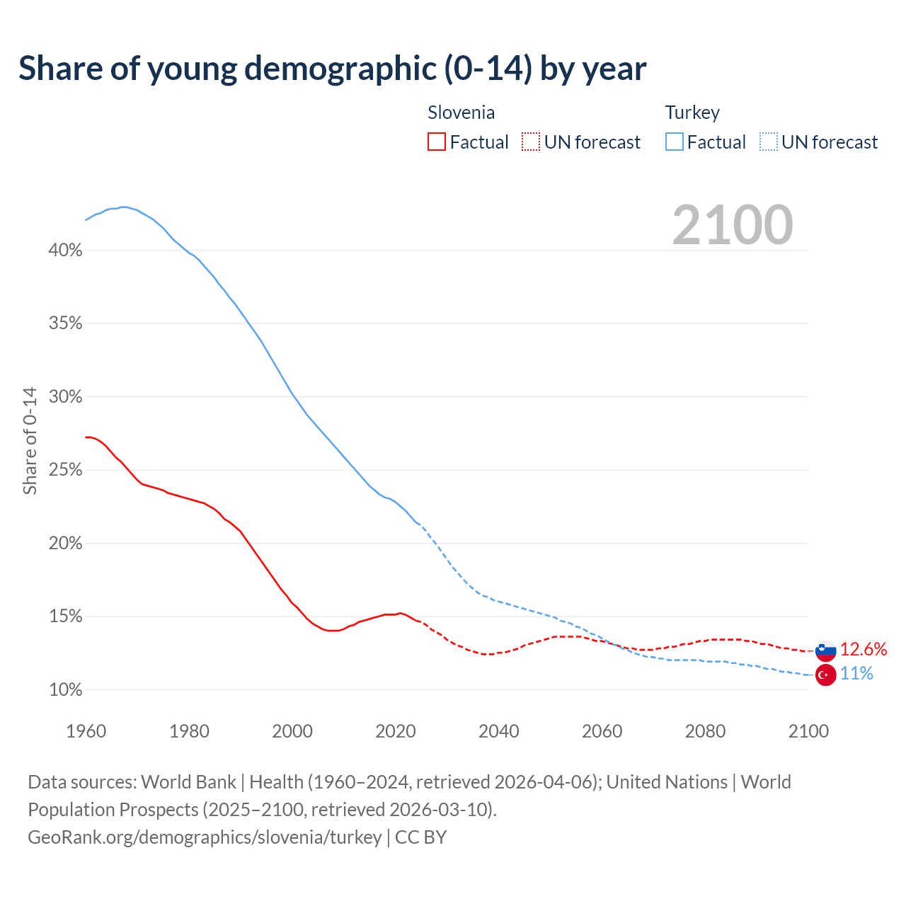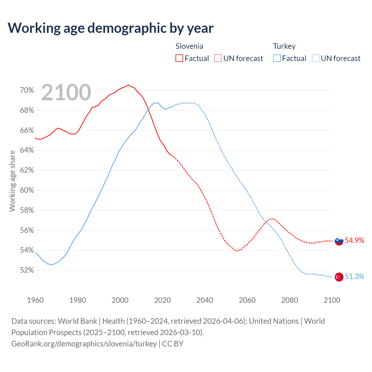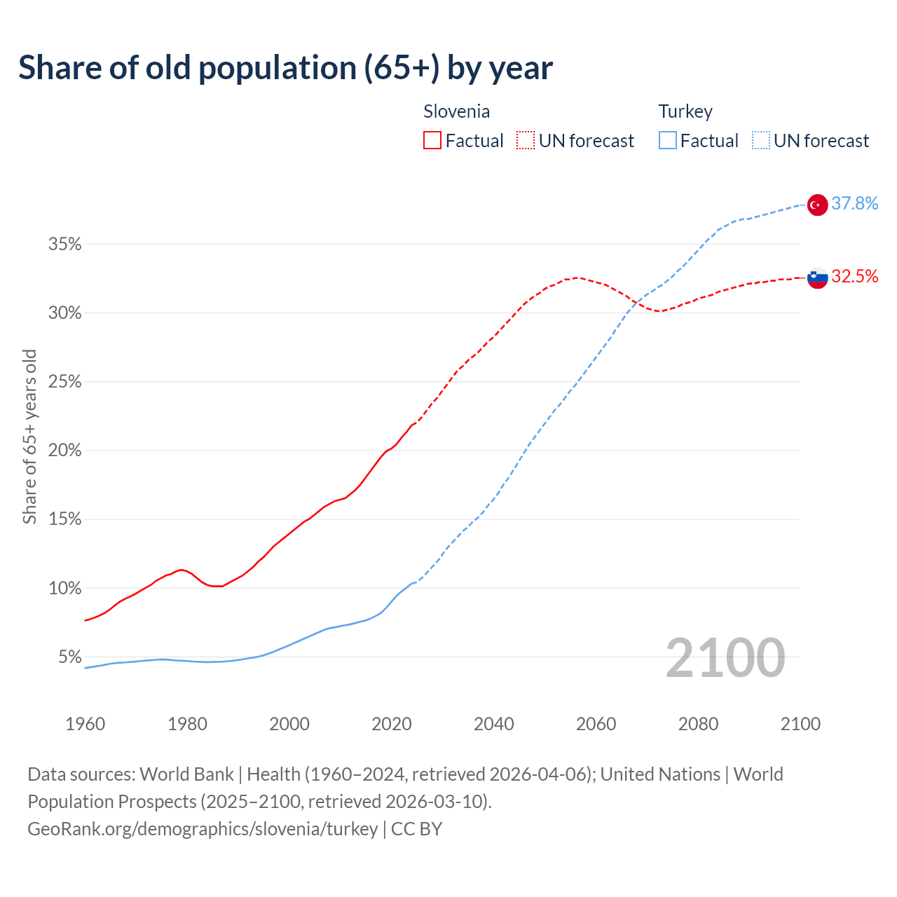 Median age Slovenia vs Turkey, 1960-2100
