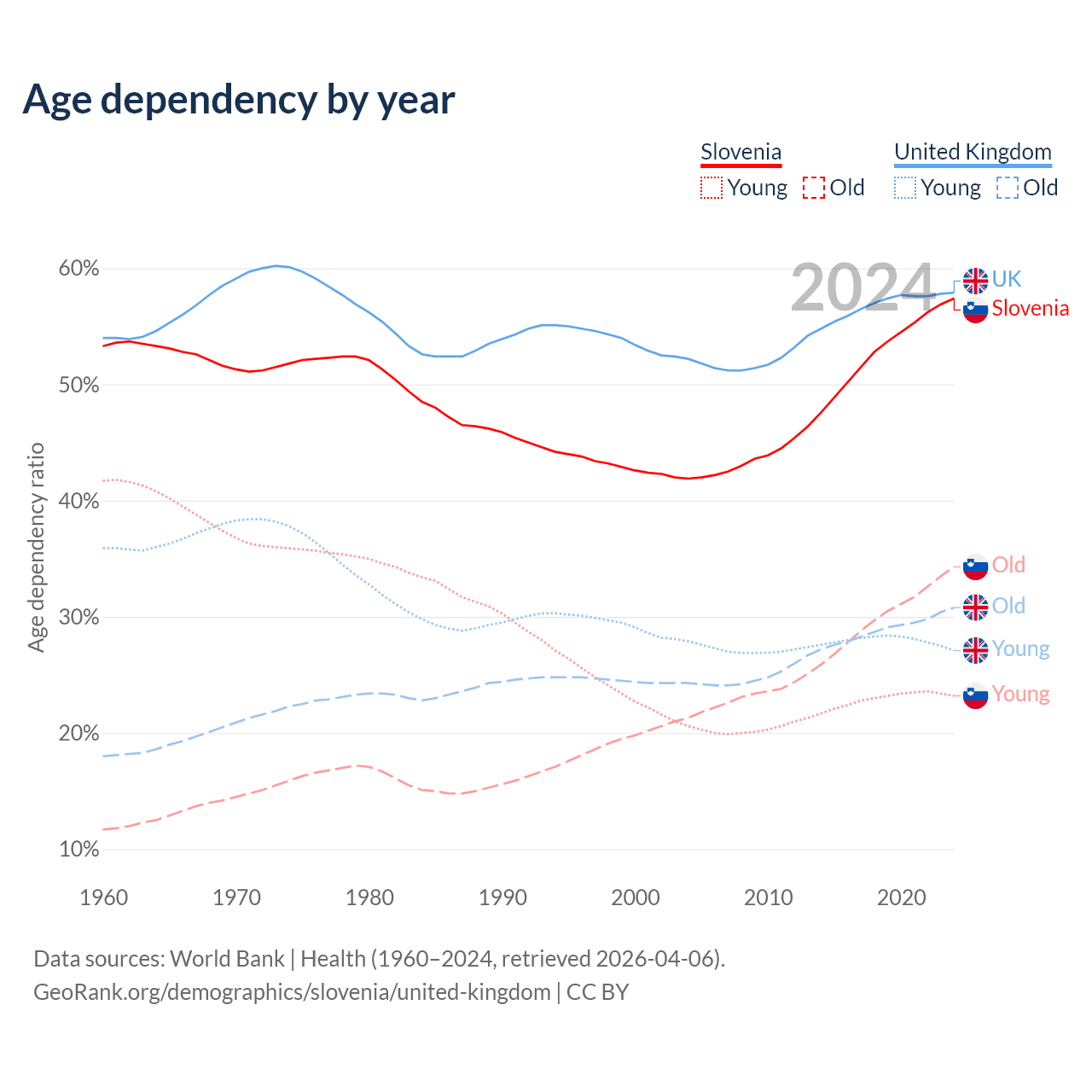 - Slovenia is ranked 14/196 by median age (oldest to youngest) vs 41/196 for the United Kingdom.