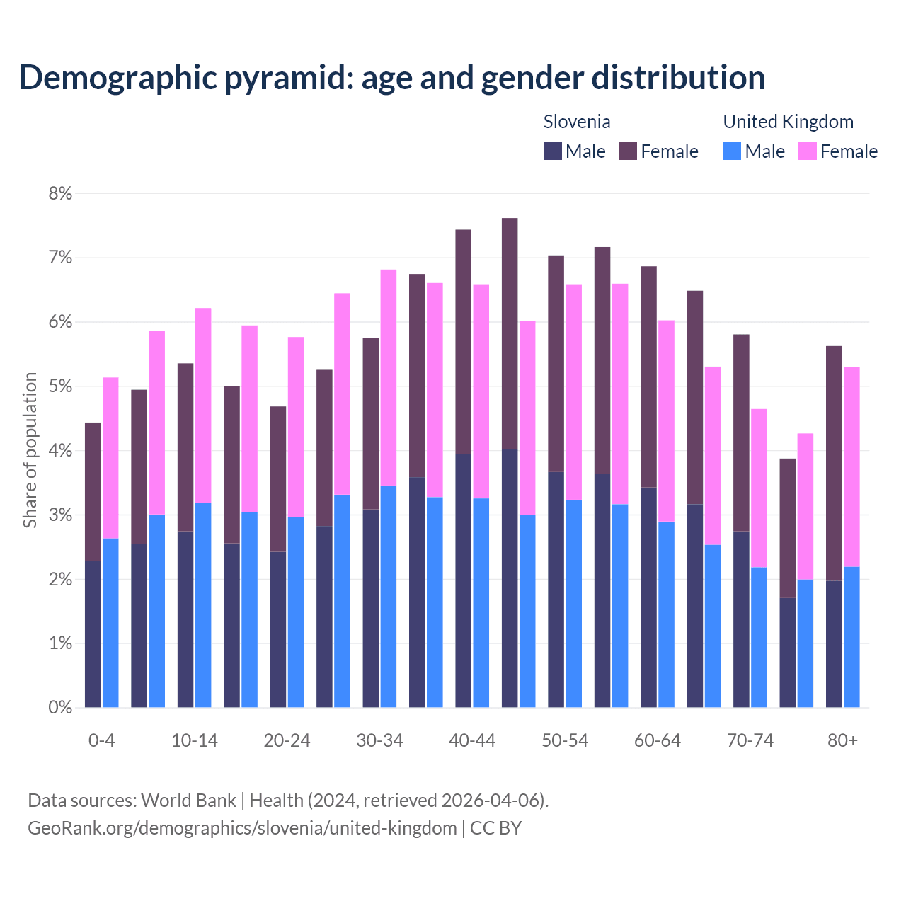 - As of 2026, the population of Slovenia is 2.12M vs 70.2M in the United Kingdom - 33 times difference.