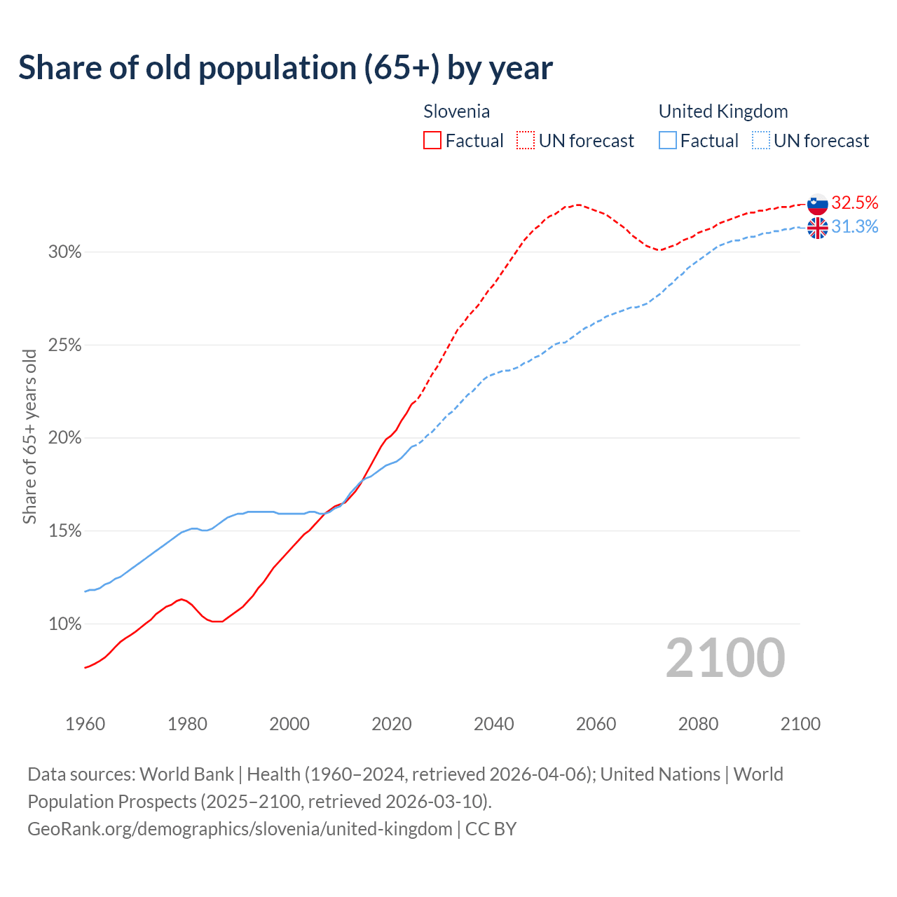 The share of older people aged 65 and over is 21.8% in Slovenia and 19.5% in the United Kingdom. Life expectancy in Slovenia compared to the United Kingdom .