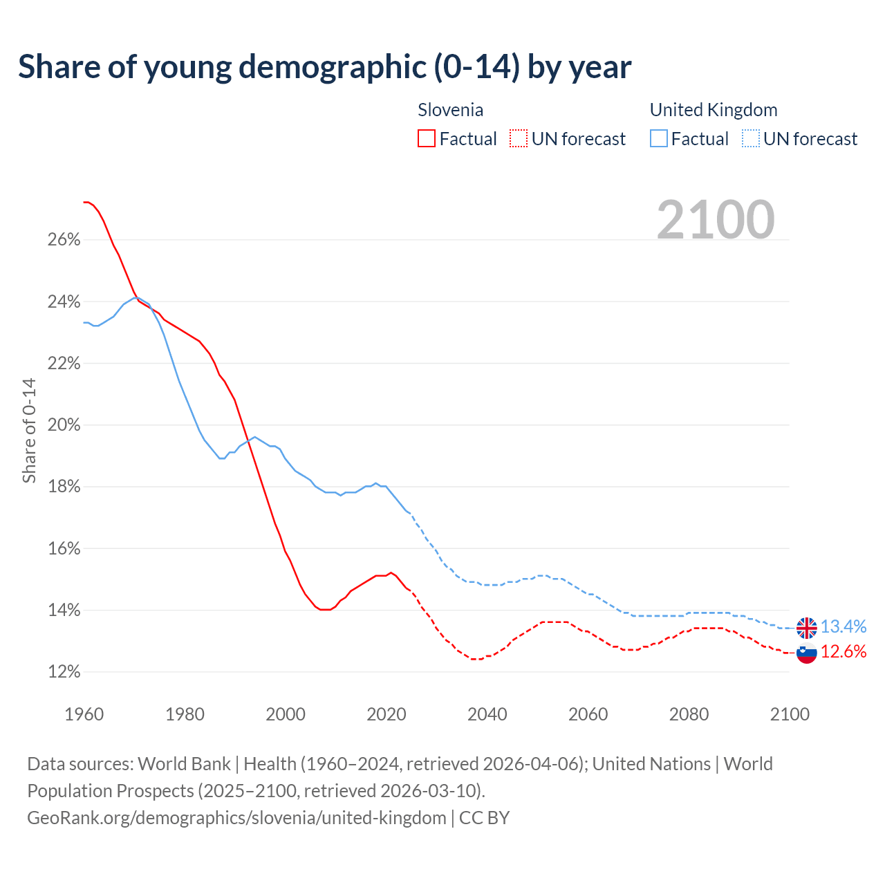 - The share of young demographic (0-15 years old) in Slovenia is 14.7% vs 17.2% in the United Kingdom.
