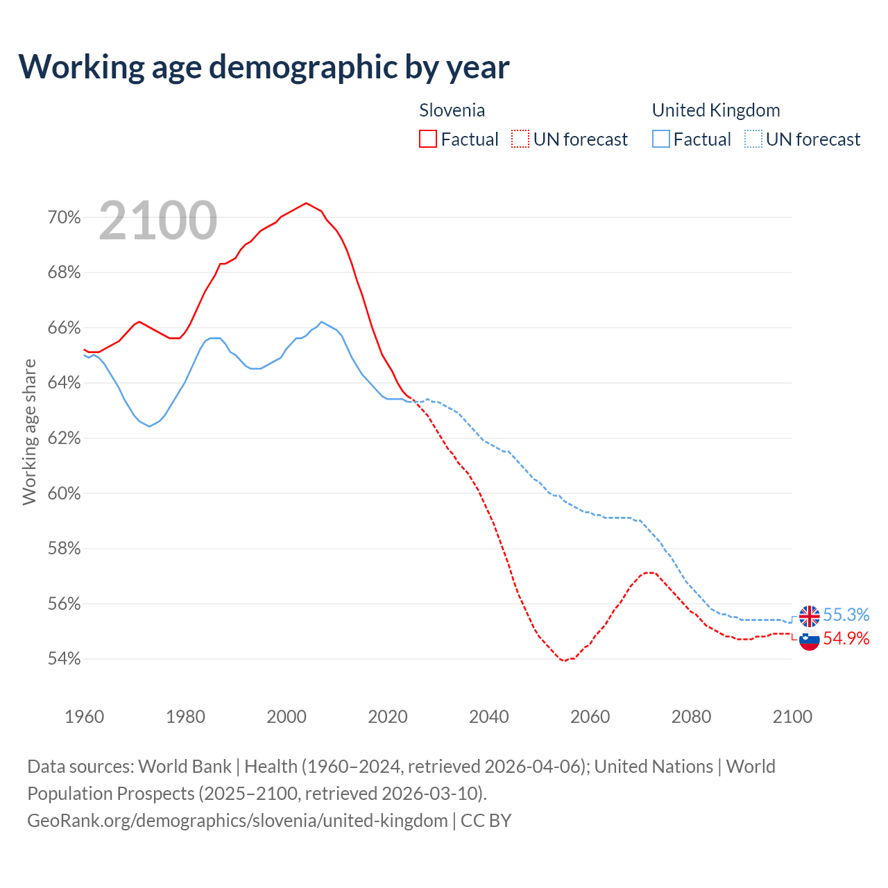 - Slovenia has 1.35M working age adults (aged 15-64) vs 44.4M in the United Kingdom.
