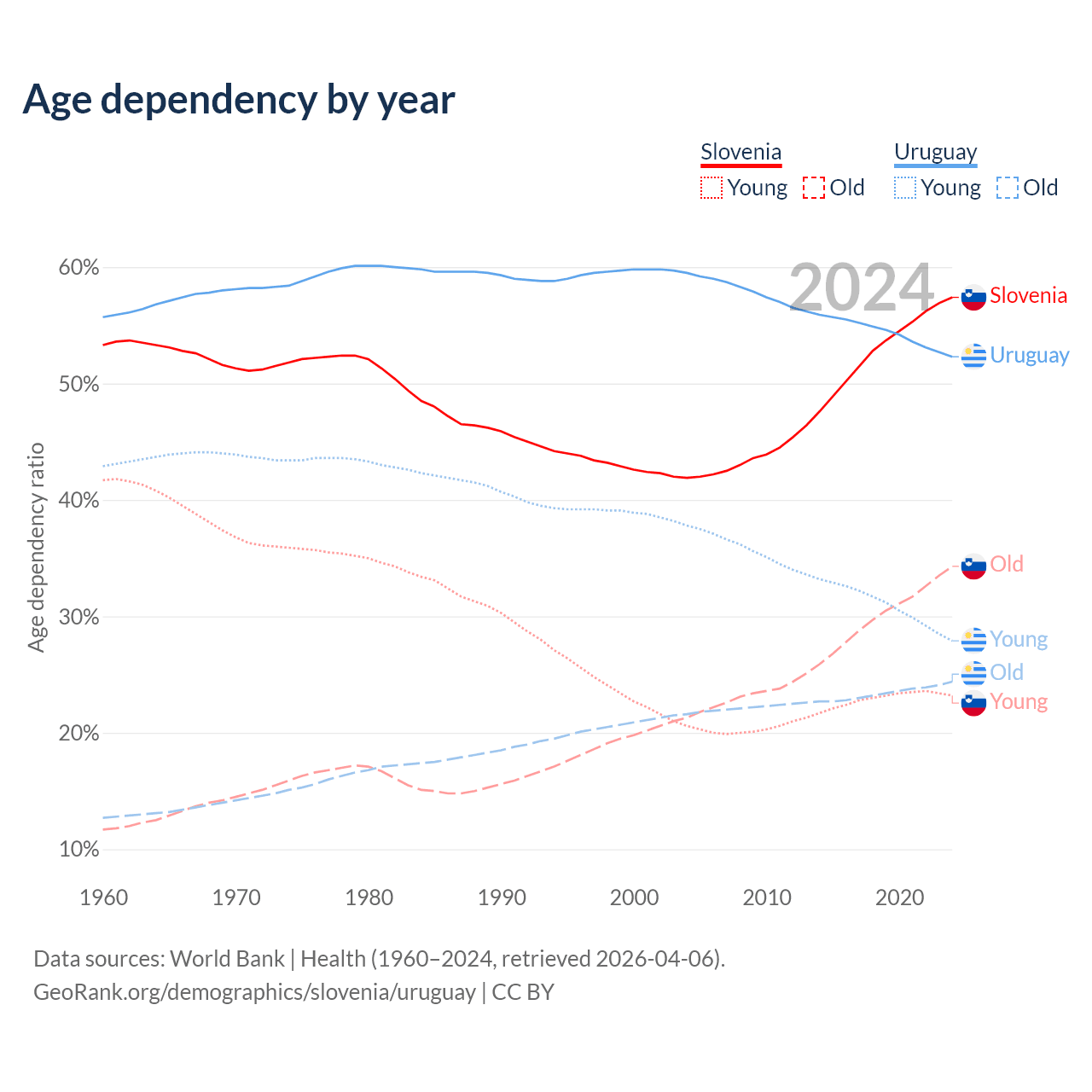 - Slovenia is ranked 14/196 by median age (oldest to youngest) vs 63/196 for Uruguay.