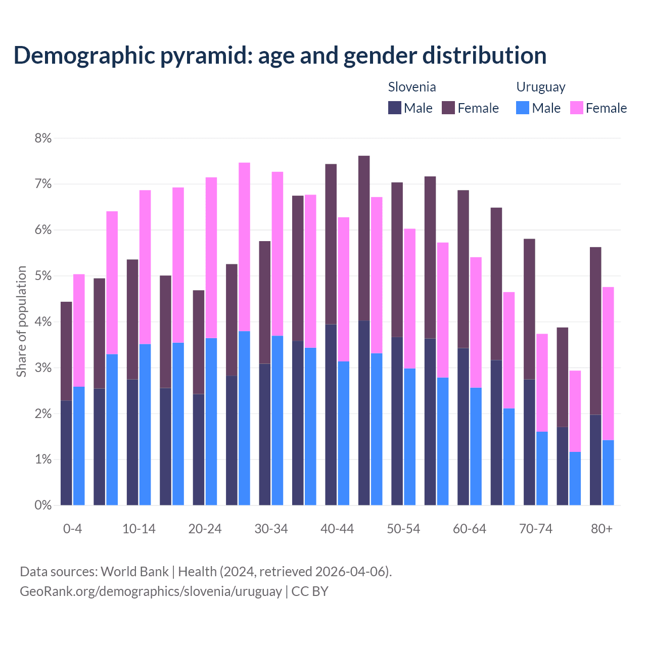 The share of older people aged 65 and over is 21.8% in Slovenia and 16% in Uruguay. Life expectancy in Slovenia compared to Uruguay .