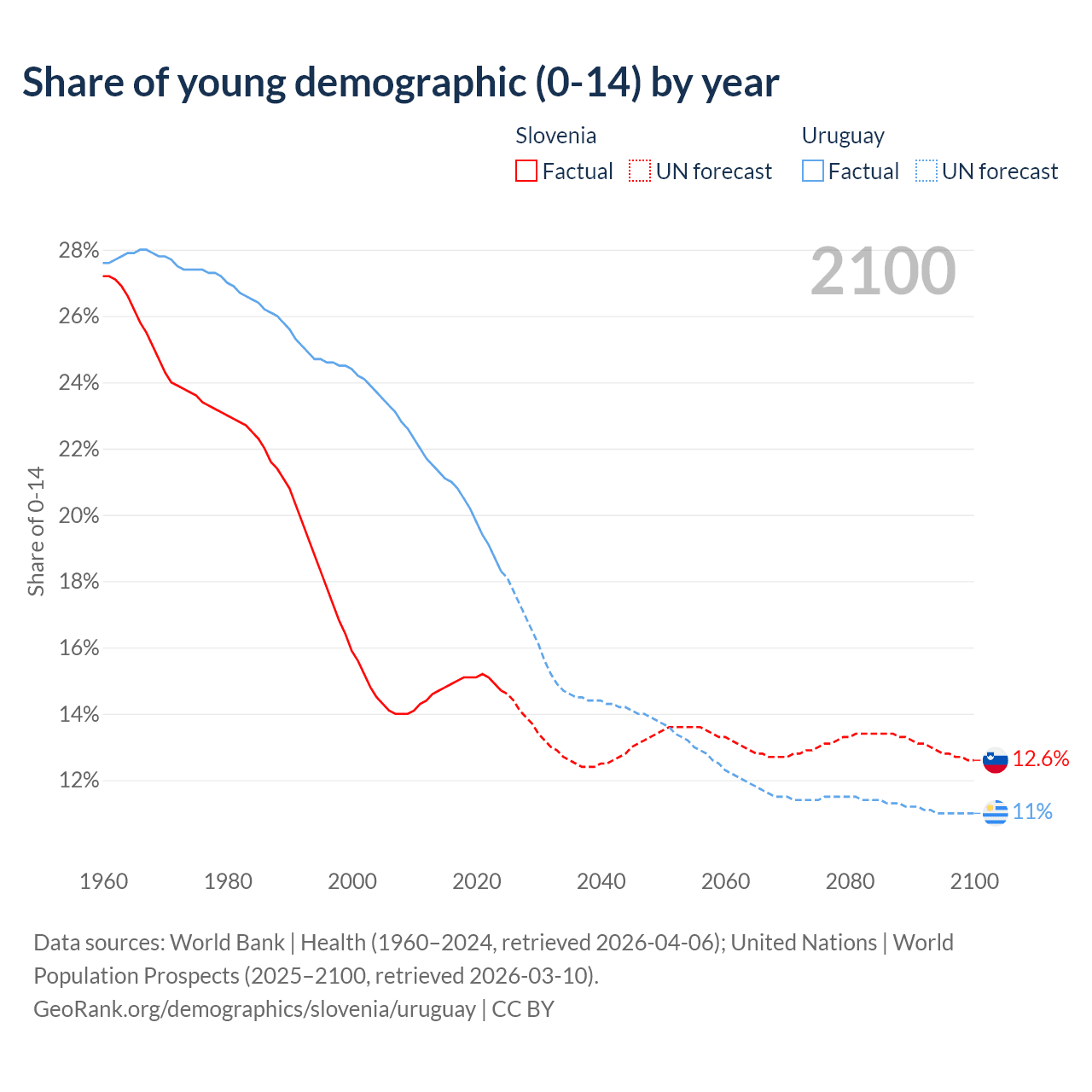 - The share of young demographic (0-15 years old) in Slovenia is 14.7% vs 18.3% in Uruguay.